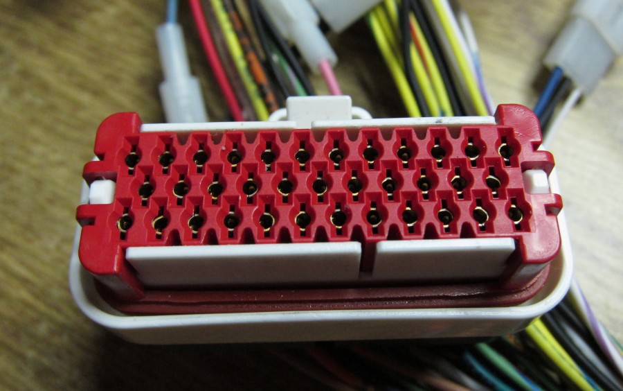The harness which is comes with is a bit of a python, as they've wired out every conceivable function and then some. One nice thing about these connectors is that you can easily remove un-needed contacts from then without special tools. Doing so compromises the watertight integrity of the connector, but for an "indoor" ECU, it will allow you to shrink the harness down to a more reasonable thickness. I haven't yet done this with mine, as I'm still experimenting and adding features.