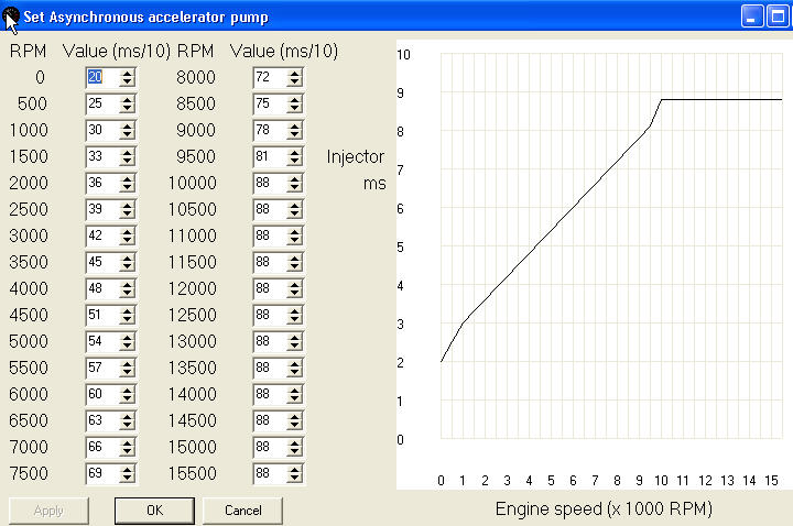 Transition time is 500ms and asynch gain is 100%. You can pretty much hammer the thing at any RPM and it behaves. The bit that sucks is transitioning between 0% and any throttle, slow moving traffic is painful.