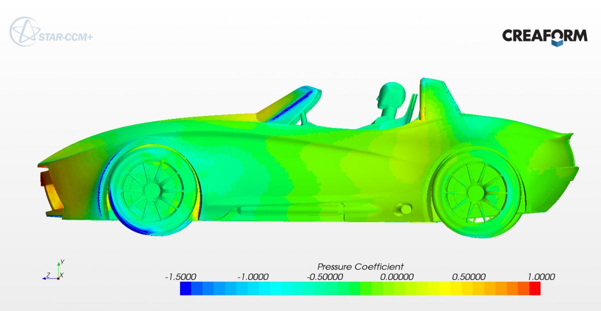 I've started getting back CFD data from the Catfish. We used the least aerodynamic setup as our baseline, and the open top car with a windscreen ended up having a coefficient of drag that you'd expect from a convertible.