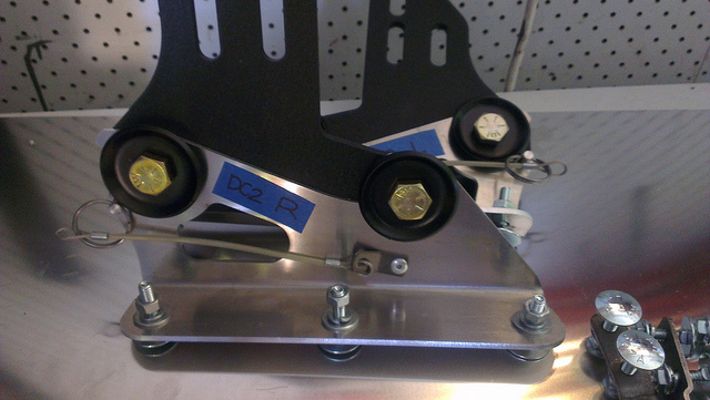 Here is a simple setup for making the splitter detach when you need it too without compromising on the rigidity of the mounts. When the nose of the splitter hits, the mounting bolts are allowed to slide in the channel you see, allowing the splitter to drop off underneath the car without causing any further damage. The kit is also simple to take off the car for those loading up the trailer. This kit is made by P1 Special Projects for the honda boys. I believe the mounts can be sourced seperately from the splitter and lip they sell.