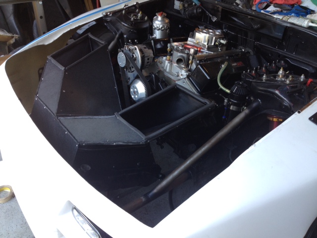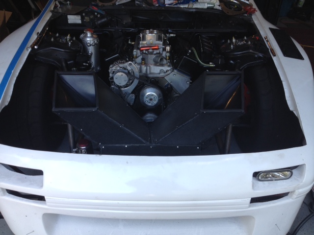 If it doesn't flow sufficient amounts of air, I'll be bummed, and will end up yanking it off and just leaving the holes in the hood. It should be in the negative pressure zone of the hood, I'm just concerned whether the volume will be enough. I can't make it any bigger than that, as it's as tight to the engine accessories as I can make it without fear of shredding a belt (engine is leaning back in that pic as transmission isn't in).
