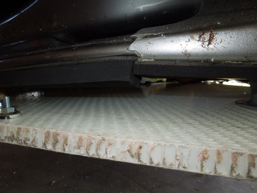 This is where it stayed for a few weeks, until I could do the edge protection. I attached some rubber seal from Clark Rubber to protect it a bit. Monopan does not hold very well to screws put into the honeycomb middle structure. Fastners need to go perpendicular to the surface not horizontal.