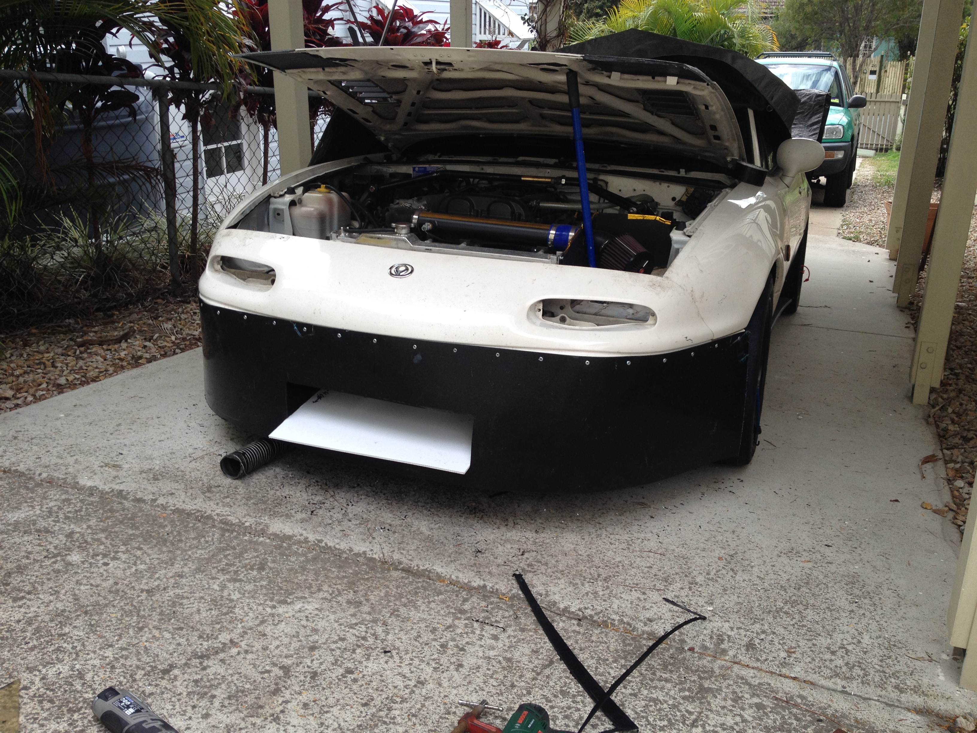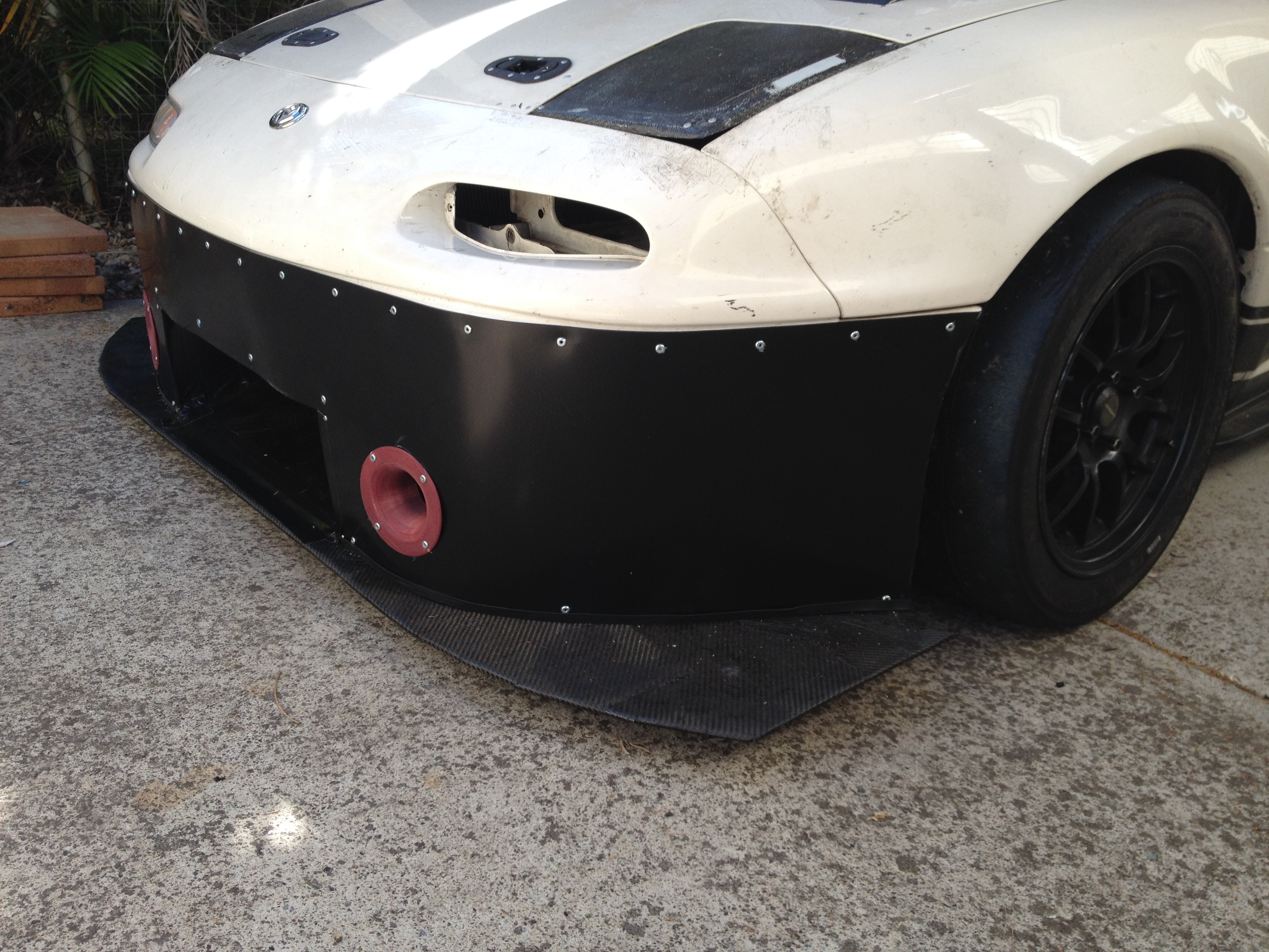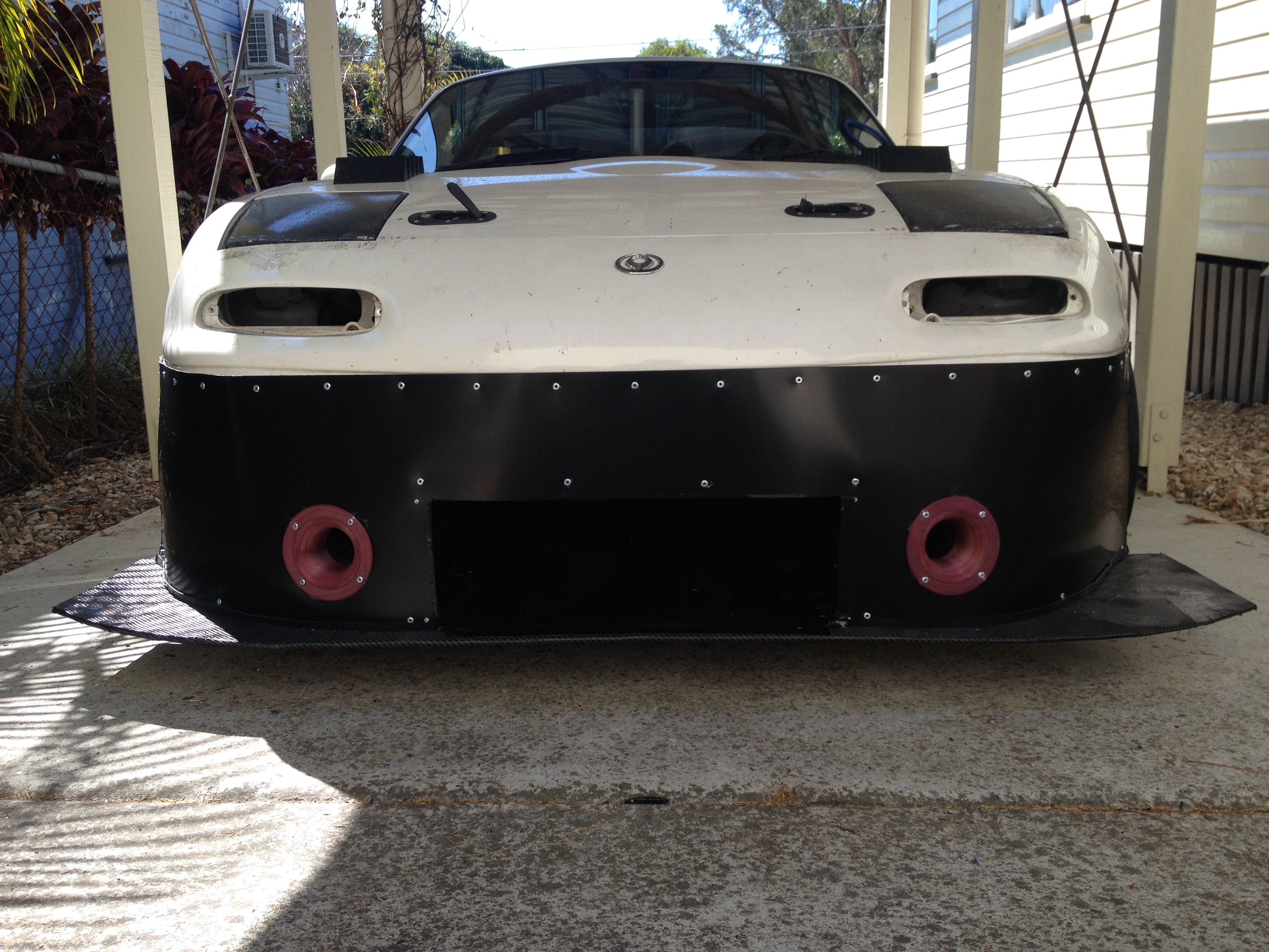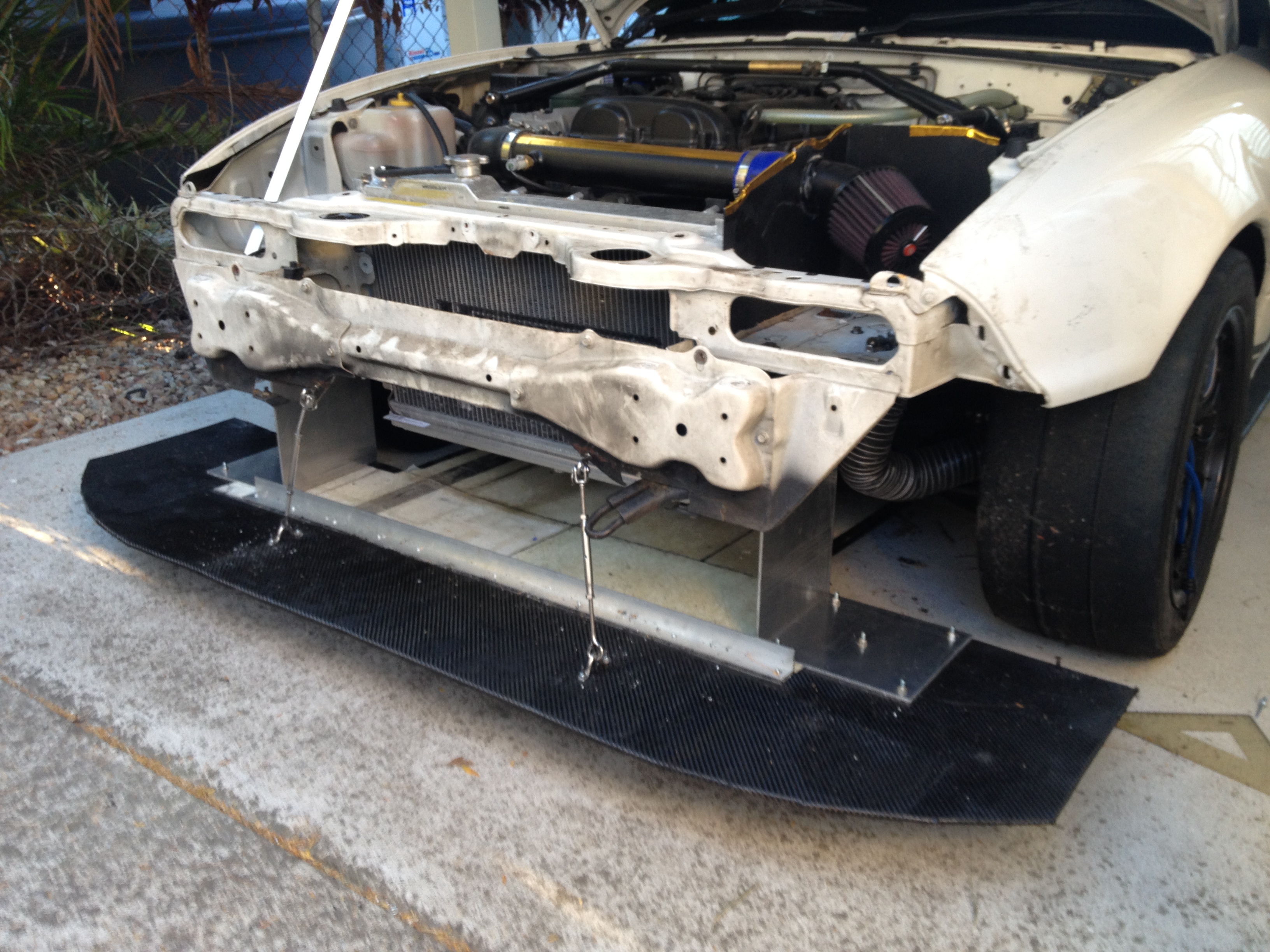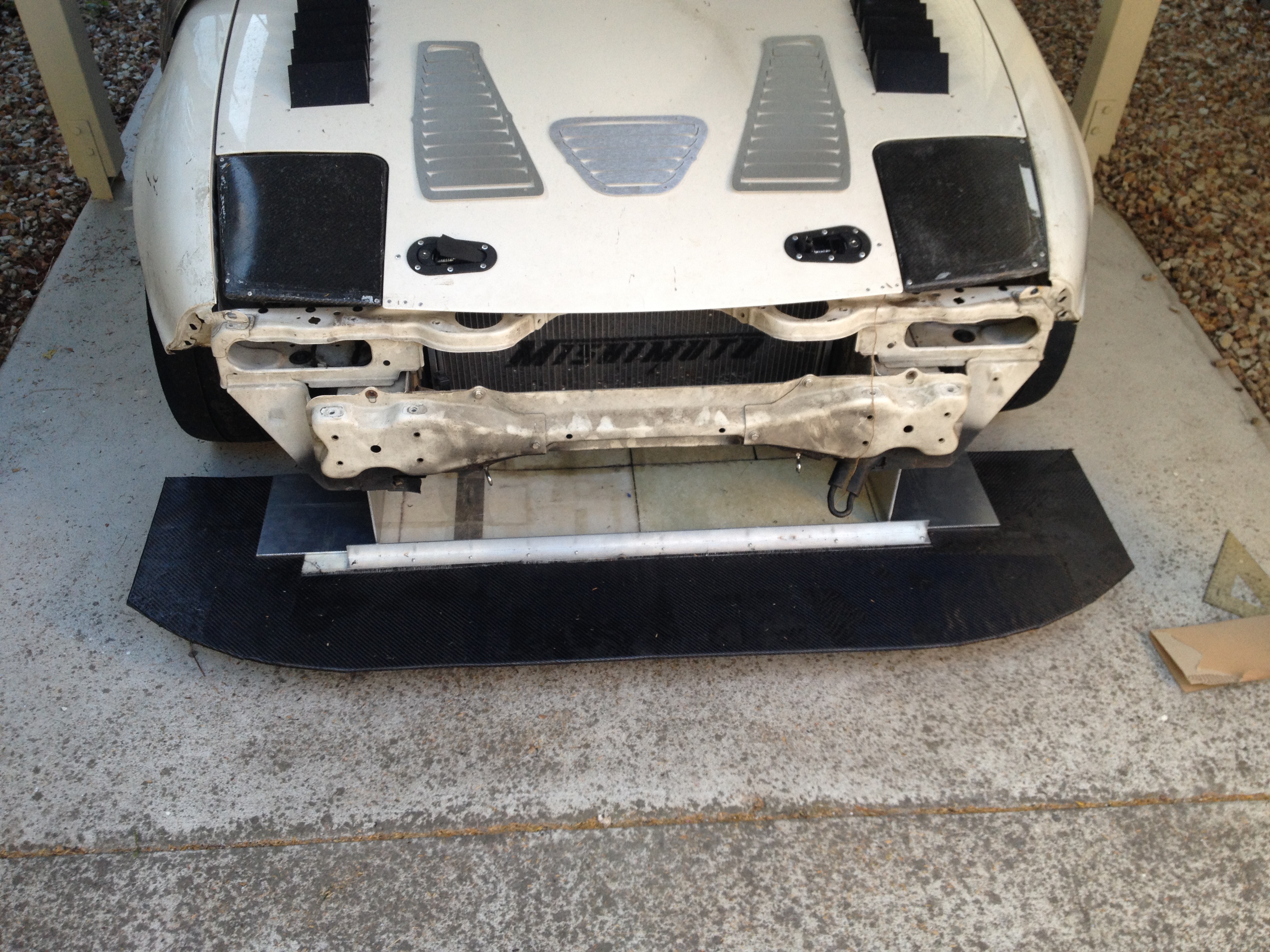 Original splitter/air dam was constructed from 3mm aluminum, and held by 3mm ally brackets to the rails, and some of those thingies you can see at the front. It was also had a set of the large garage vary canards, and custom end plates either side.