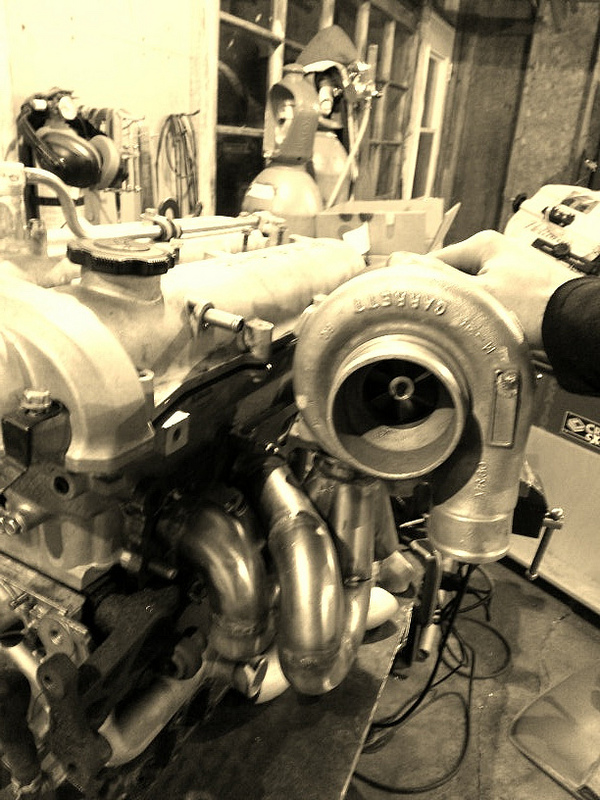 Shown is my blown 2860 and a manifold I am building for a Miata.... but if you look deeper than that you can see a partially dissassembled BP- for which I have most of the parts to rebuild.