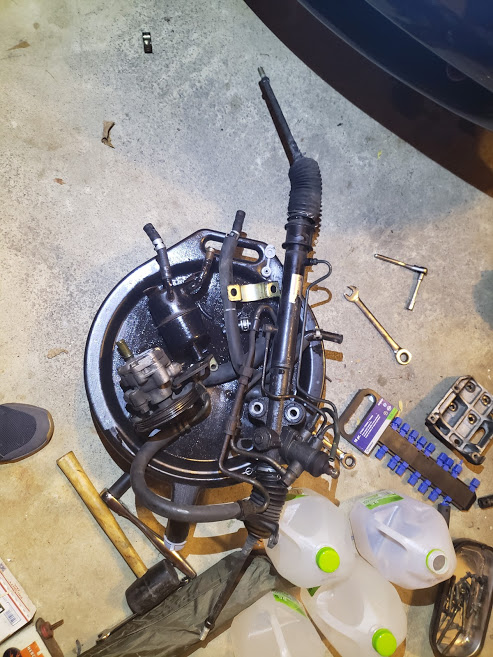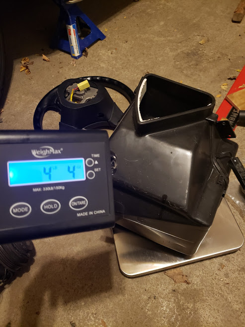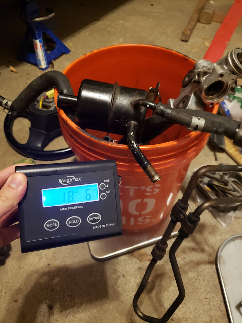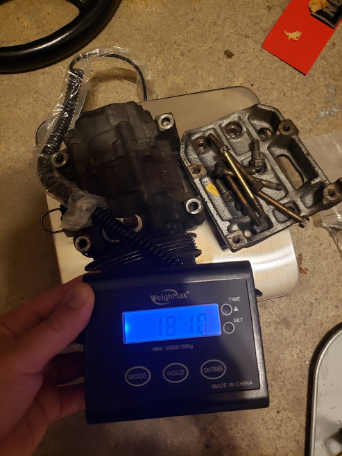 Depowered rack 9.2lbs Powersteering rack and all the associated stuff. 18.6 lbs its all out AC compressor and bracket 18lbs Under dash AC filter. Replaced with tube so I can retain defrost. 4 lbs
