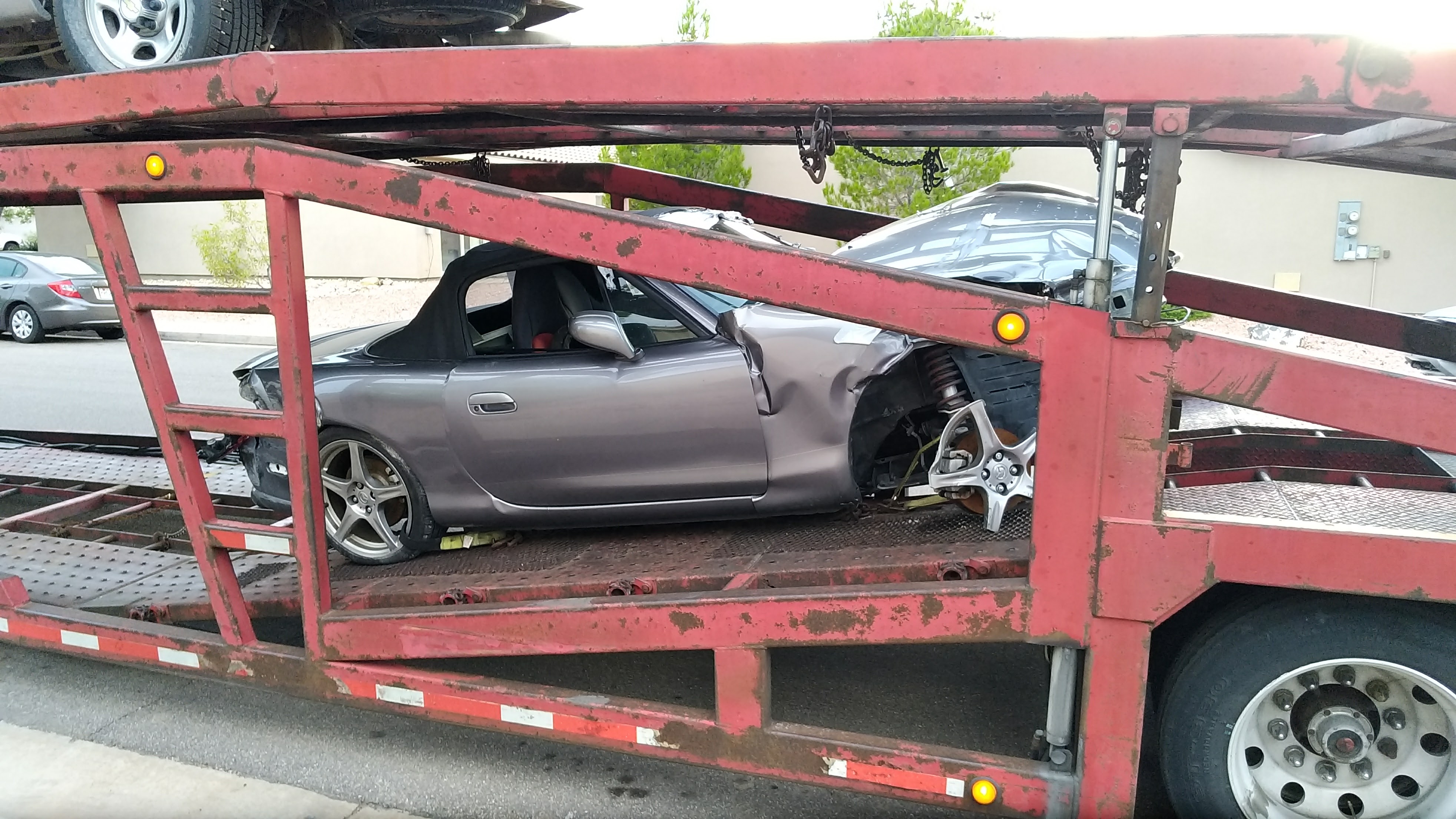 Car arrived Monday night. Friggin' Copart insisted on loading it on the part of the trailer that made it most difficult to remove. We were able to pull it down into the belly and then unload with a forklift.