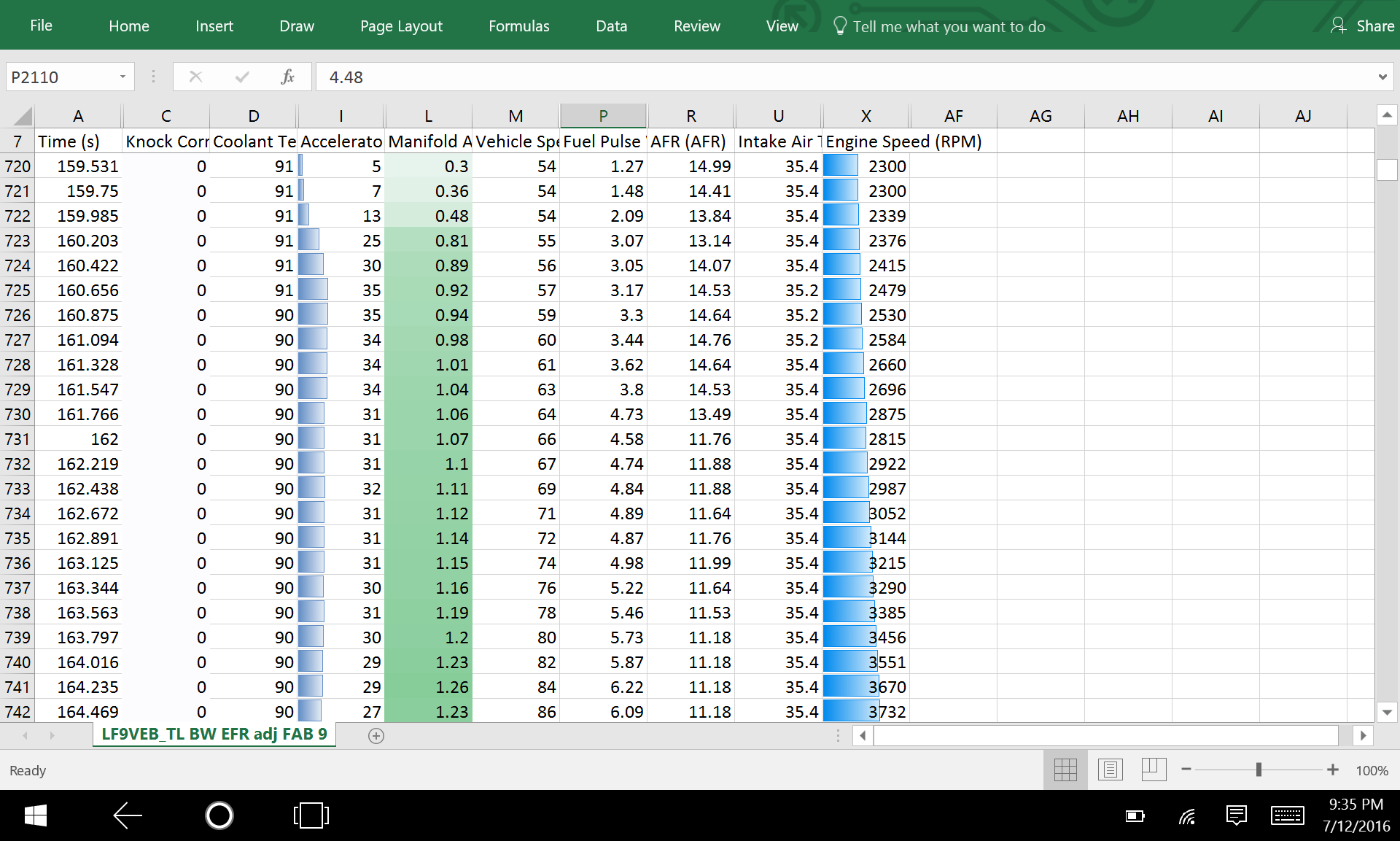 I've hidden a bunch of the columns, as most of the ECUTek tuners consider the truly important data points (ignition timing, VVT angle, drive by wire throttle plate management) to be proprietary information. The current map is hardcore conservative on the ignition timing and throttle maps (plate position never truly gets fully open despite my 100% throttle input.) The load vs VVT angle map leaves much to be desired also.