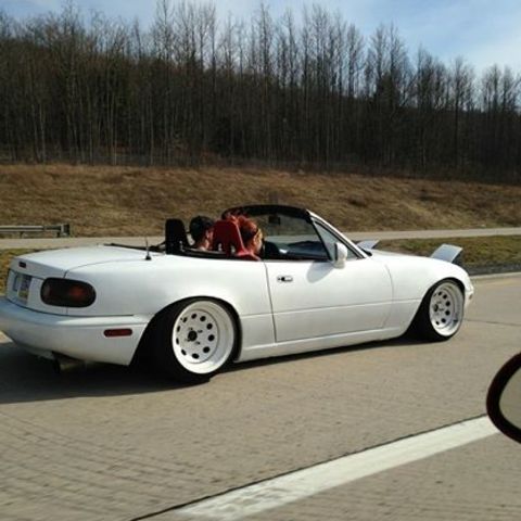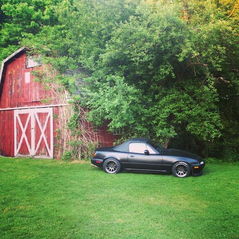 Oh look, another plasti-dipped flat black Miata, slammed on racelands and XXRs with a GV lip.
