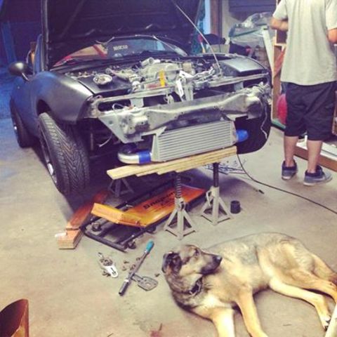 Next, was the turbo. Being the previous subaru enthusiast that I am, I opted or a used TD04 off a friend. I took it apart and powdercoated my cool side red, and purchased a FANTASTIC kit off fellow forum memeber Sturovo, who welds up exhaust bits. He made me a manifold, downpipe, oil and coolant feed and return lines all for $650!! Along with a used CX Racing intercooler, with help from my pup Harri.