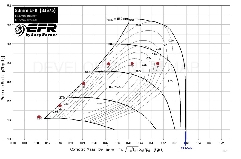 I would rather run less, but realistically would not happen for 599 (let's call it 600hp). Now not sure how much the calculator takes into account the effect of running high octane/E85 as there can be much added timing which will help VE. It does recommend values for the turbine efficiency to be increased by 10-15% at lower RPM range with twin-scroll but I did stay on the conservative side. It's all on paper (well on a site) but people have achieved much higher numbers from these EFR's than just paper. I mean you got 458whp from a 6758, so a compressor with additional 16mm should do the trick and get me to that 600hp (and that's at crank!)