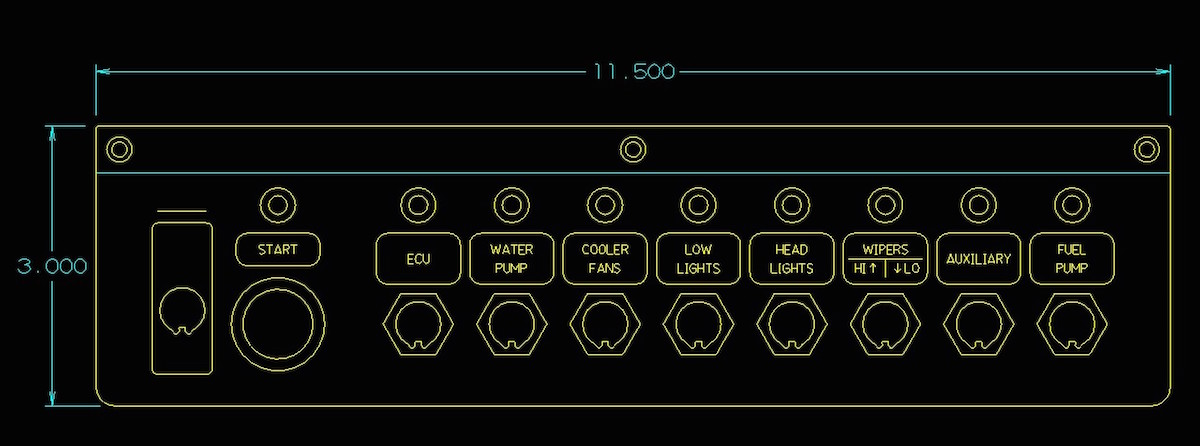 Well I guess time to do a quick update. Finally leaving at the same location as the car so I can get back at working on her. Have the switch panel designed to replace the quick one I made to get the car running! Here is a CAD image of it done by Viking Panels. Once it arrives here I will change that and put the BOSS fuse/relay box to replace the crappy Chinese boards I put in originally!