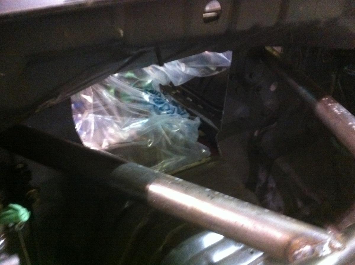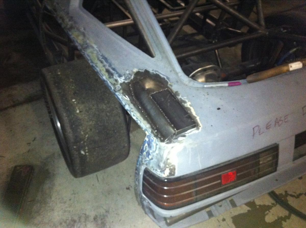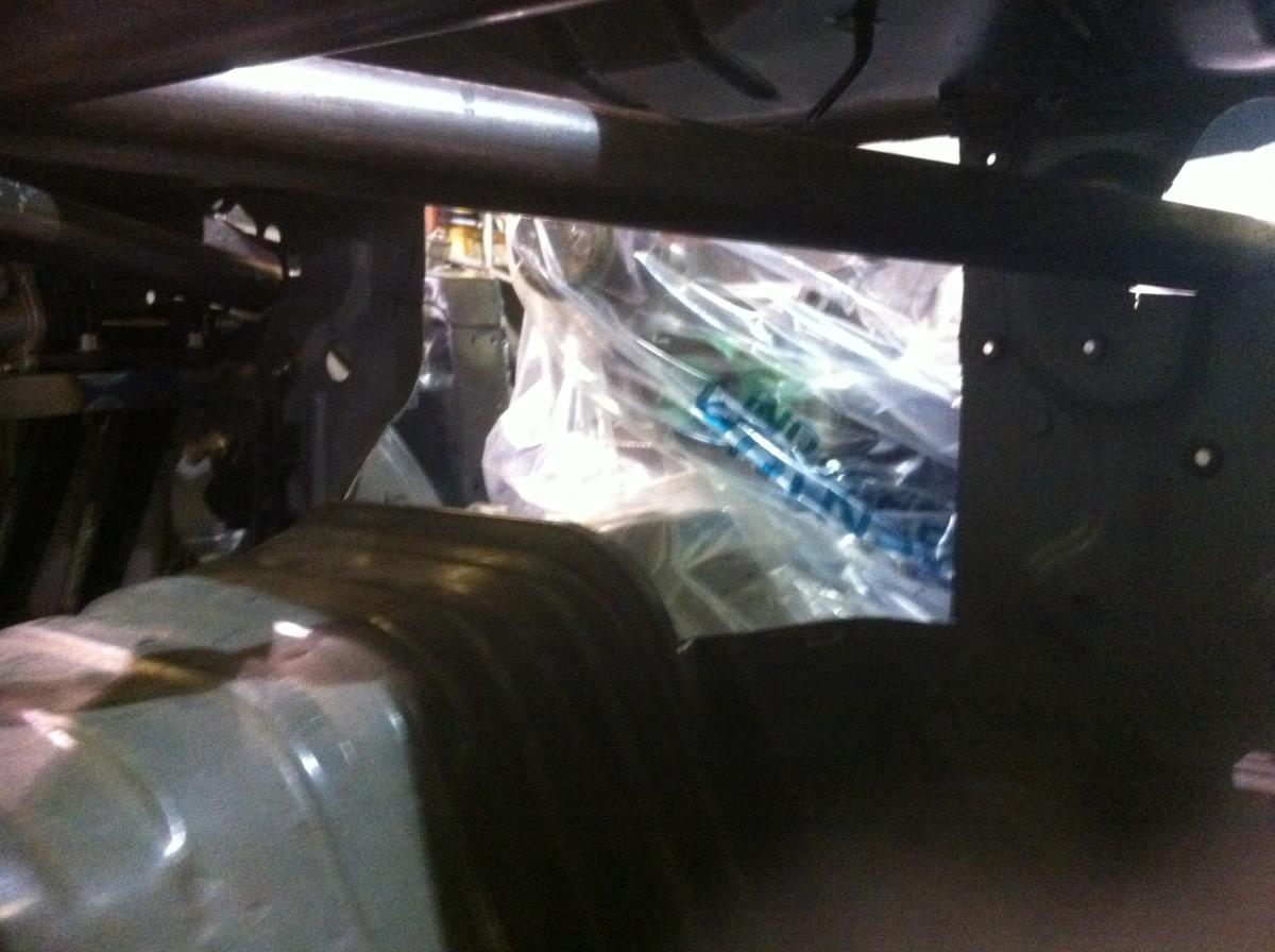 And the start of exhaust system: first thing is cut some holes to fit the 3.5" exhaust that will come out the passenger side in front of the rear wheel!