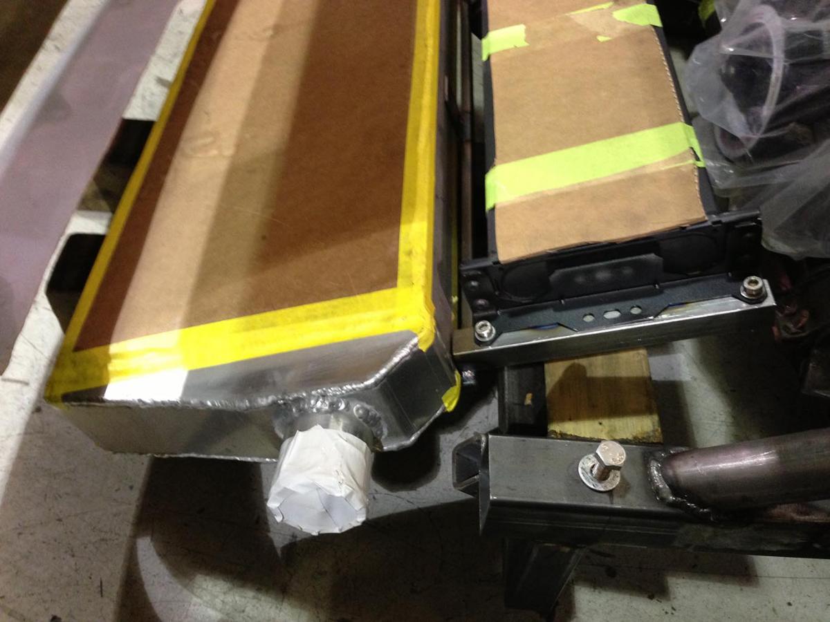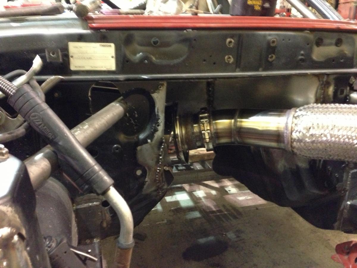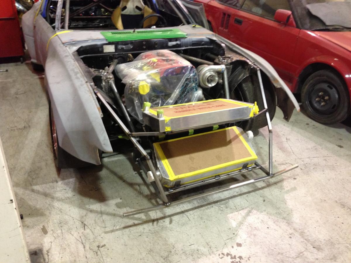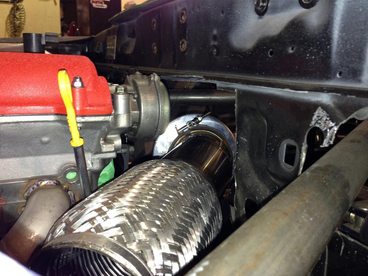 The coolers' location and mounting has been redesigned for a better venting out of the hood and under the car. It is a v-mount system now. The exhaust is fully mounted now too (excuse the crappy photo) and I have made a mount for the windshield defroster.