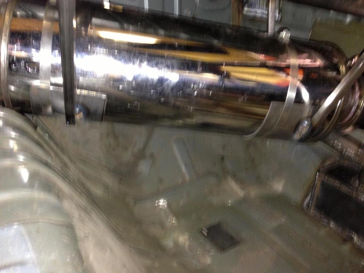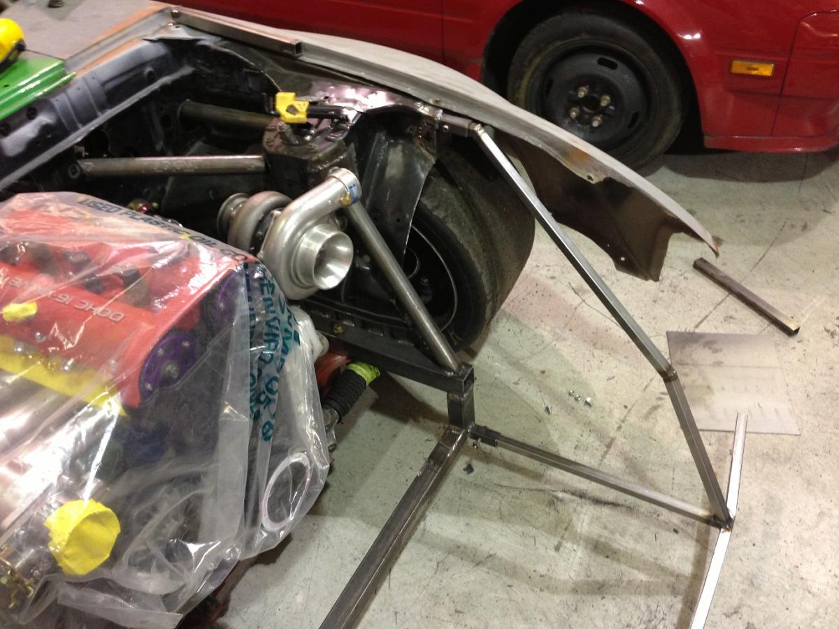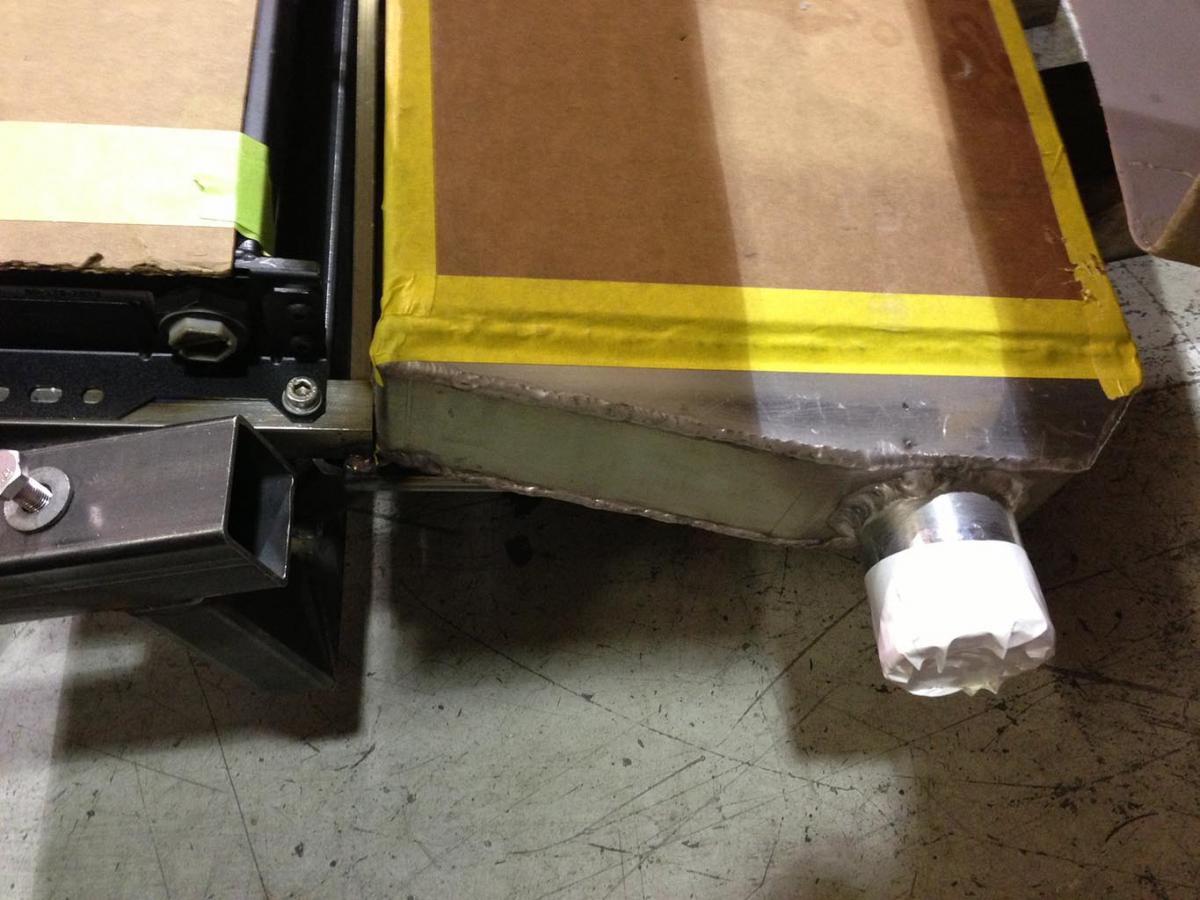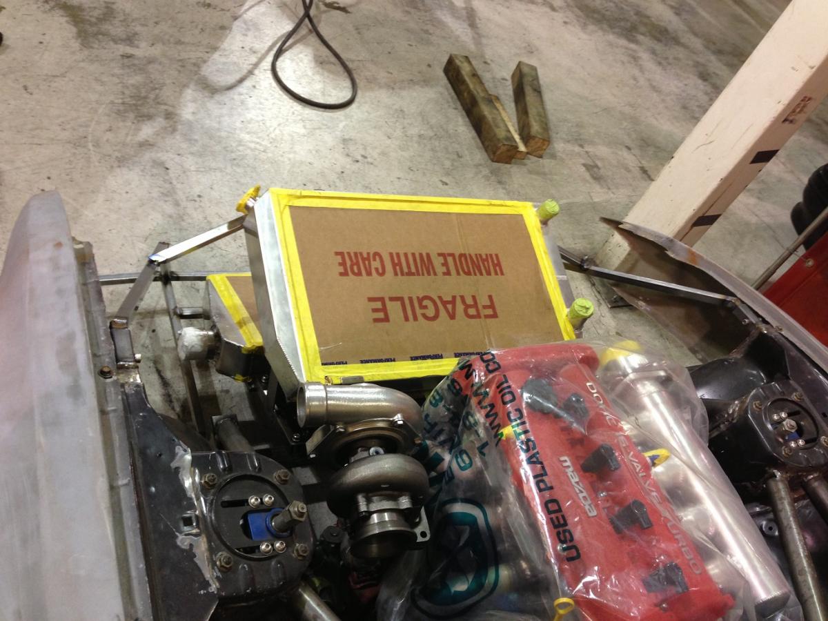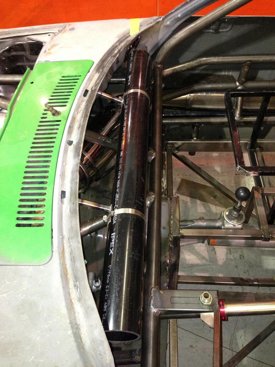 The coolers' location and mounting has been redesigned for a better venting out of the hood and under the car. It is a v-mount system now. The exhaust is fully mounted now too (excuse the crappy photo) and I have made a mount for the windshield defroster.