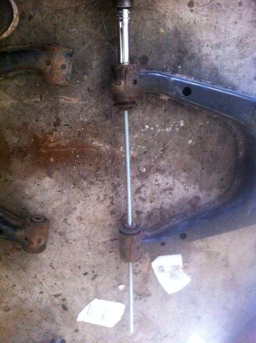 Went and bought some new threaded rod. This time 7/16". It worked great on everything but the rear upper control arms, which have a bolt diameter of 3/8ths.... now I see why. Anyways got all the rest of the bushings out with a bit of fire and an impact gun. The front upper control arms flexed a bit which scared me, but they look fine now. Here is a picture: