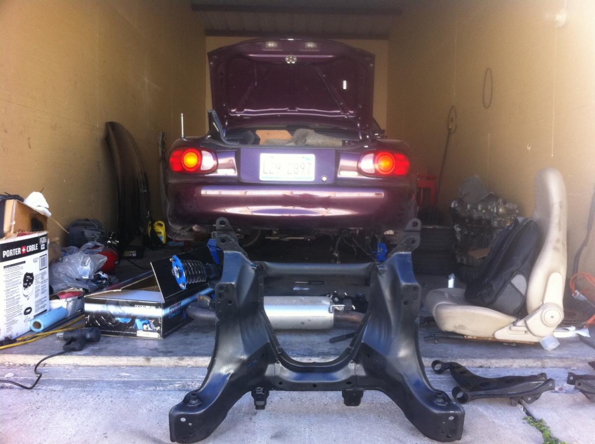 The shop is dirty as hell, so I decided I will finish the front subframe/control arms/rack/suspension and bolt it back up to the car before moving to the rear. Once the rear is done I will install that ****. And finally put the engine back in. I MAY have it done by Monday. That assumes my bolt extraction works out.