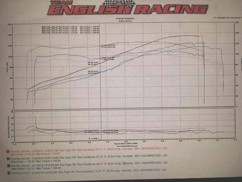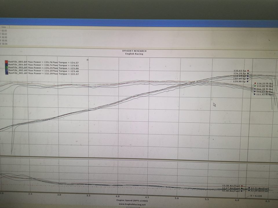 Finally got Ryan to send me the dyno sheet we had printed at ER. This one compares two of Ryan's pulls (both 135hp), Lazarus' old 1.6 setup (123hp) and my friend Nial's 1.6 (115hp).