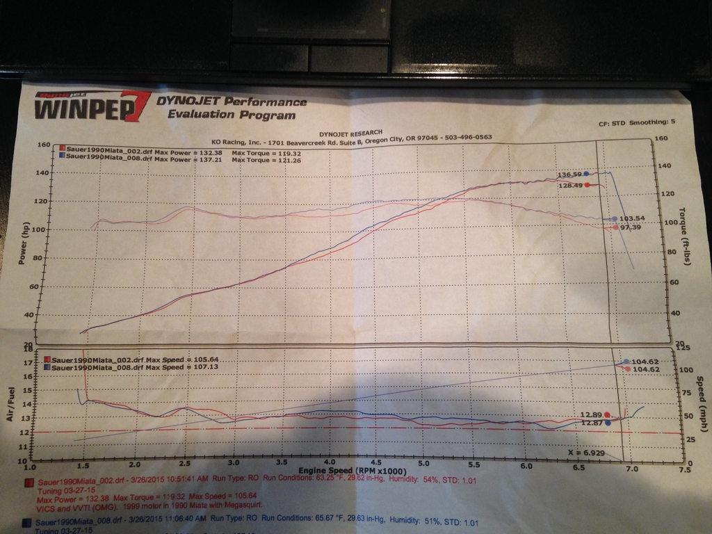 It's sort of illegal in the dyno world, but if we scale the graph to match our previous numbers at English Racing, we would be at 143hp and 127ft/lbs along with that mid range bump, and that's right were we expected to be. It's a seriously fun car right now.