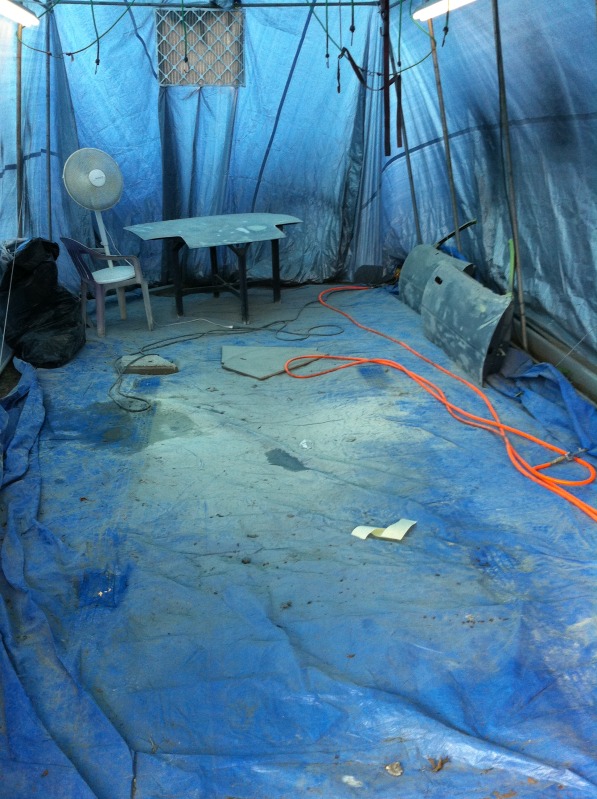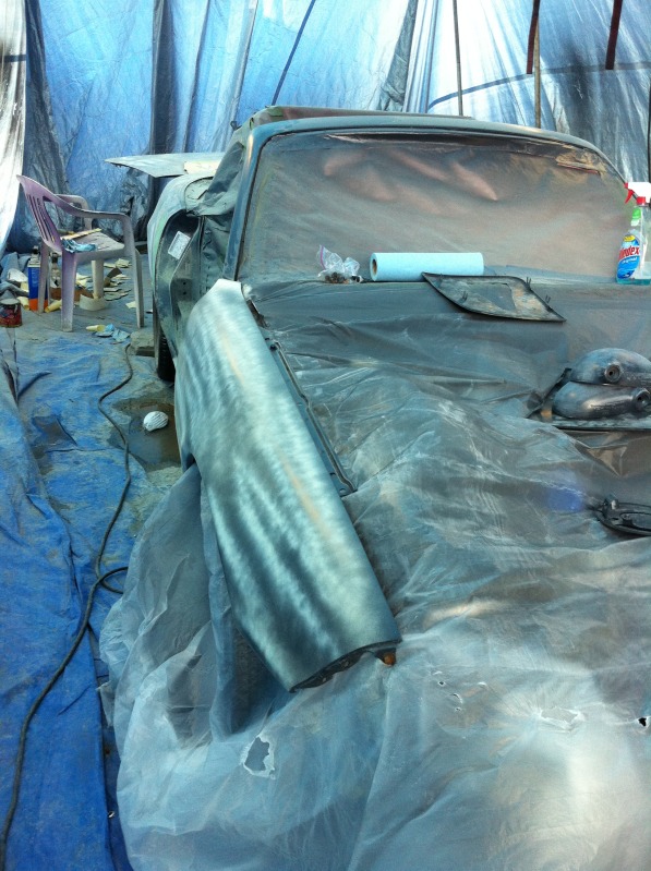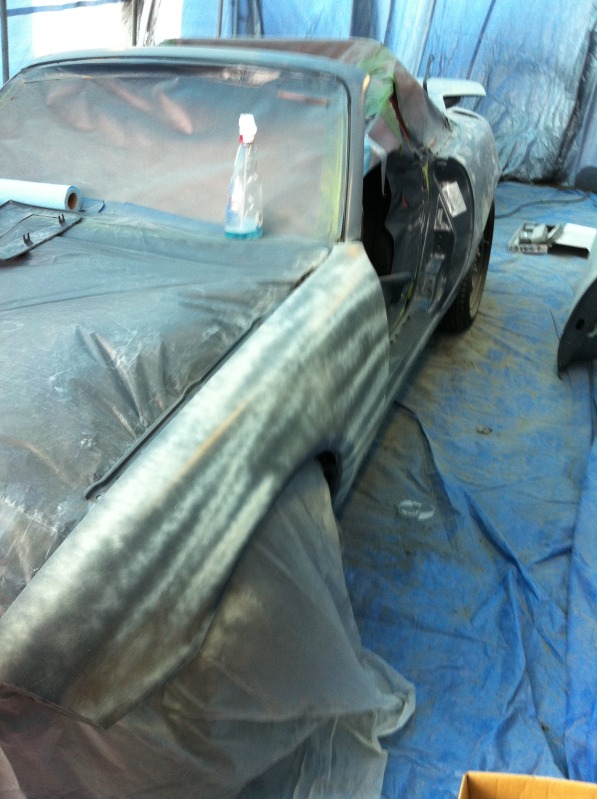 This weekend I finished the bodywork and cleaned the tent. I prepped for primer but the weather looked like ****. I ended up getting the car in the tent and mostly masked, then gave up for the weekend. I hope that the humidity doesnt make the tape fall off.