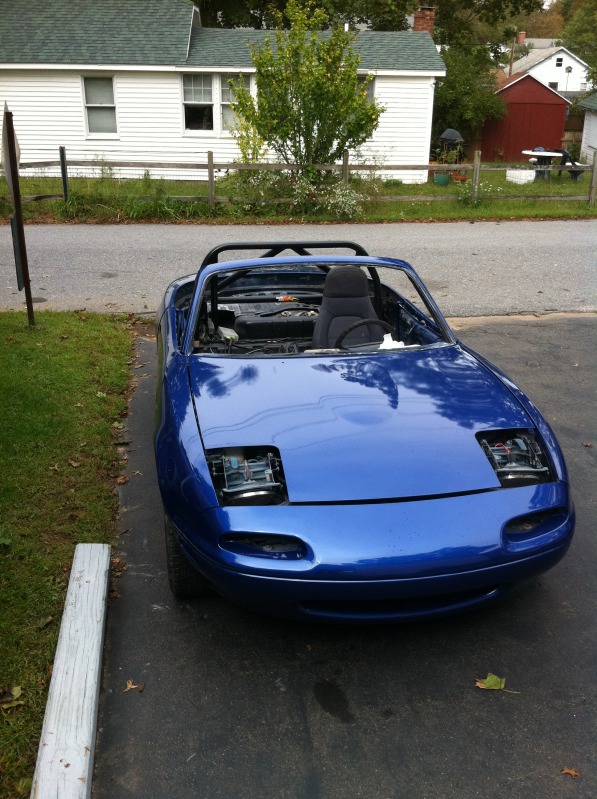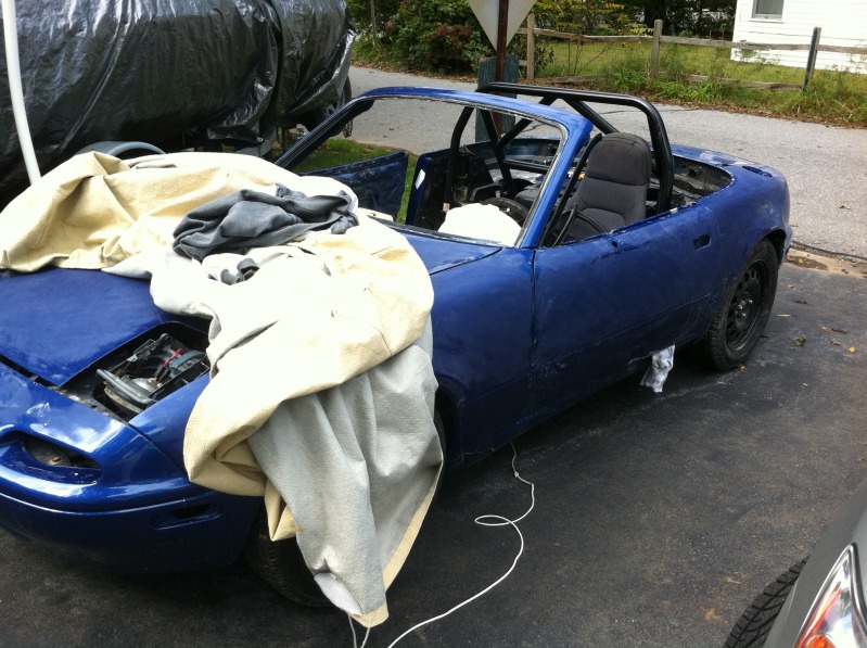 I put the car in storage yesterday. My dad and I got a 10x30 that'll fit both of the miatas. There is an RV parked outside of our storage unit. It was really tight getting the car in... and I decided to drive it in and trust my friends guidance. Well, one guy can only watch one thing at a time, and I managed to scrape the side of the storage unit :(. The damage isnt THAT bad. No dents, but it did chip the base/clear on the front right fender around the wheel arch. It DID NOT go thru the primer, so rust wont be a problem. I should be able to blend it in pretty good using my rattle can of the metallic base, and then clear over it and sand it in. Still makes me want to cry.