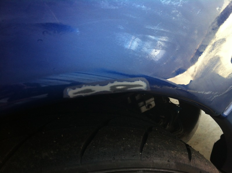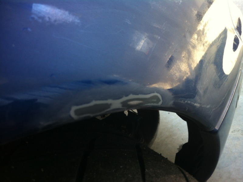 Today I learned how much of a ---- it is to spot repair metallic paint. I started by sanding the damaged area with 220. I didn't go crazy because I wanted to minimize the repair area. Next I feathered with 400. I cleaned and prepped the area and masked off using the bent over tape technique to reduce the chance of getting a hard edge. I did 3 coats of color (rattle can base coat), moving the tape back on each pass.