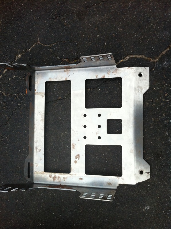As for the seat brackets, I took rough measurements, and came up with a design that would work for both the driver and passenger. I designed them as "blanks" with the intention of cutting and drilling as needed at assembly. I took my dimensions and drew it up in Autodesk Inventor (3d cad) and then sent it to one of our suppliers at work to be laser cut.