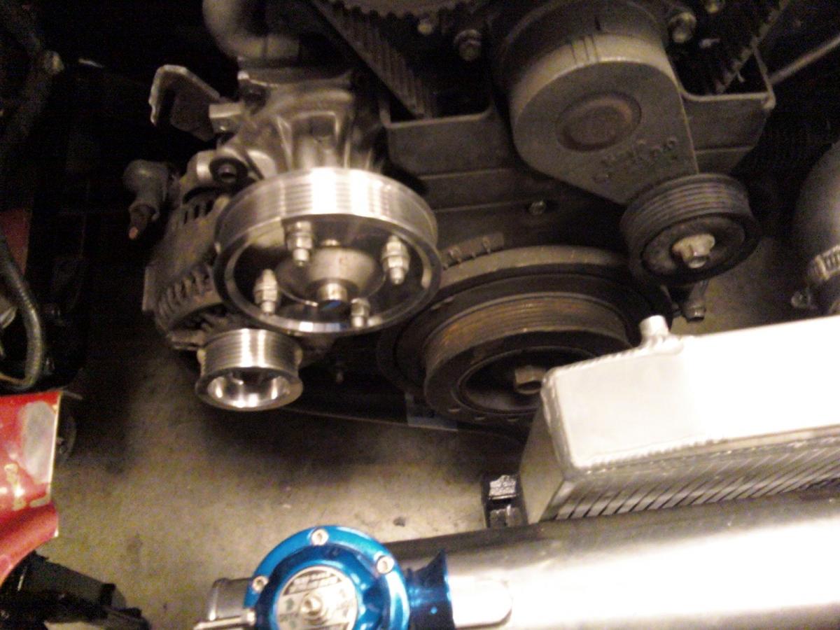 Got a little work done today its snowing pretty bad outside so I can't go to the store and get parts so I have to do what I got. I did get some progress though. I installed the roll bar most of the way need to tighten the bolts for the down bars. I picked up a set of sports brakes complete (used) they came with everything calipers,brackets,two sets of rotors, and pads for $150. I got my alternator and water pump pulley installed and they look great. I also remembered to pick up some nice hardware for my rollbar from work. Nice stainless cap head bolts. I will post some pics tomorrow of the calipers and rotors installed, and anything else I get done.