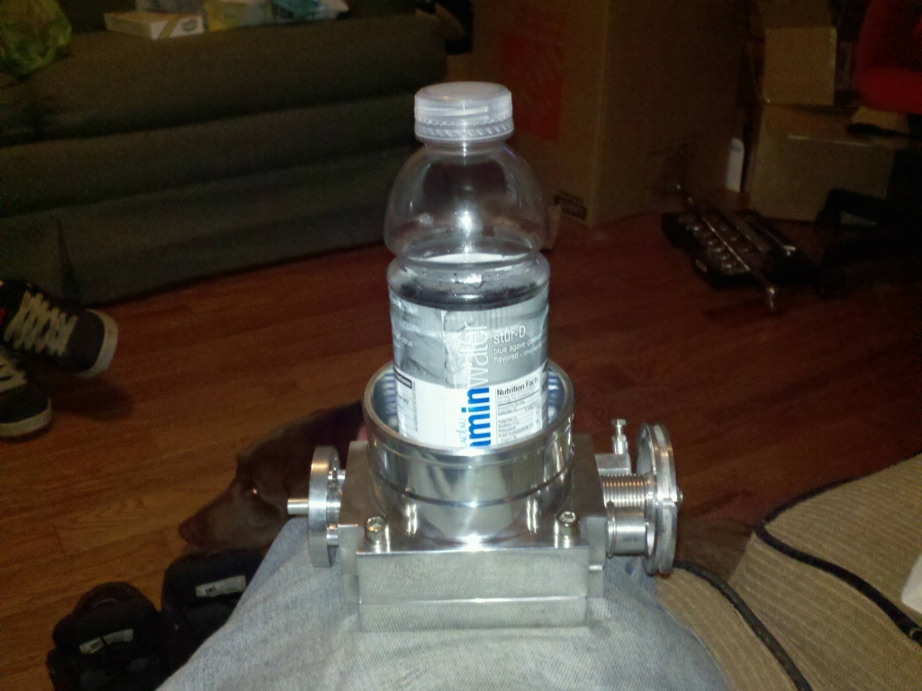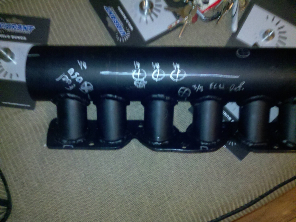 Ok here are some more pics. I got my throttle body in last night and it is huge and I also mocked the mani up on the car again and it fits perfect. I marked out where to put the bungs for the vacuum fittings. Here are some pics of the mani mocked up, marked for the bungs, and the throttle body in comparison to a vitamin water bottle. Hopefully I can make the flange to mount the throttle body to the mani today and then get it powder coated by this weekend. Sorry my camera was acting shitty yesterday so some of them are a little blurry.