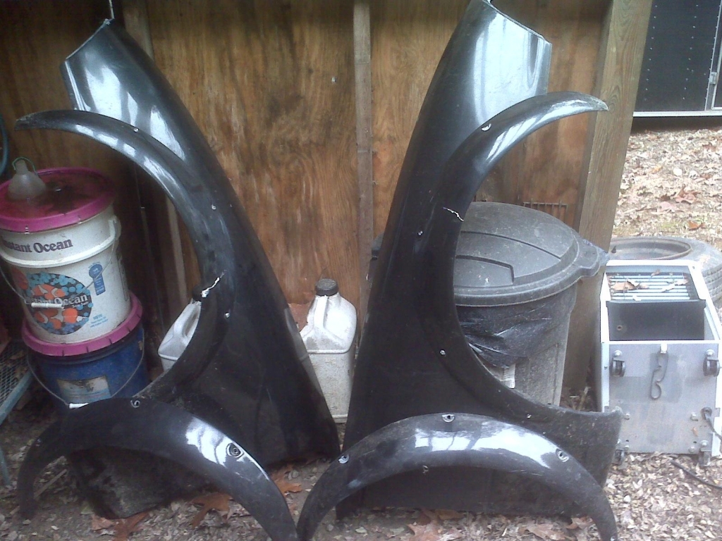 Just a minor update I had presents at my house when I got home yesterday. They looked something like this!!!!! Being my cheap *** self I got these by chance. My neighbor races SM and he needed a set of stock fenders as these were cut for the flares so he told me he would trade for some stockies. So my stock fenders come off and these go on as well as the rear flares. Should look pretty sweet. Has anyone kept the stock mud flaps with flares like this? If so please let me know.