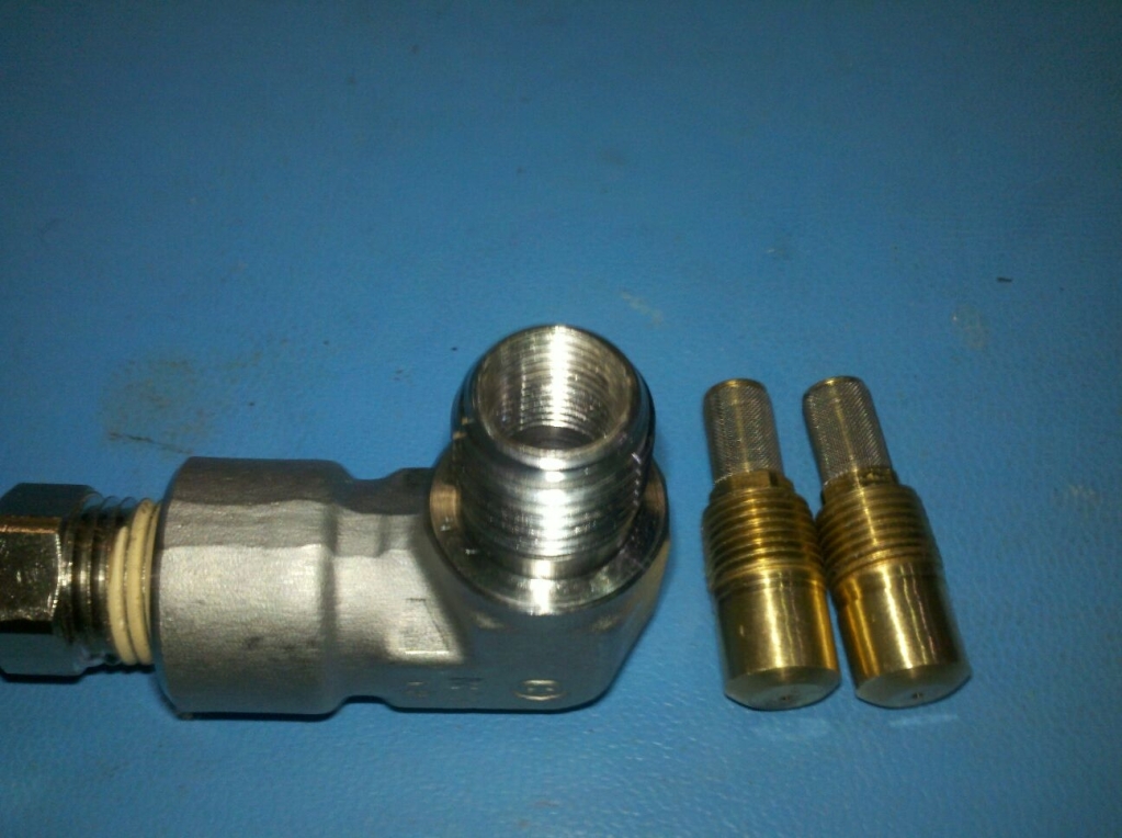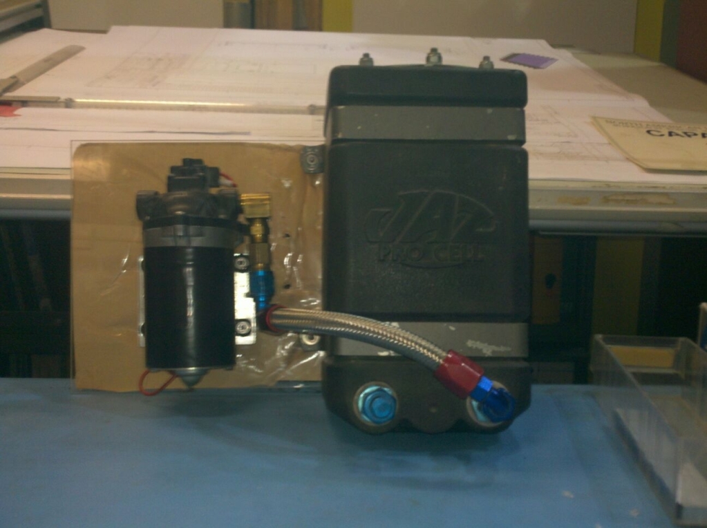 Ok here are the pics of most of the parts of my methanol kit. I hope this will help someone who is worried about spending lots and lots on a meth kit want to build there own as well. Fist off I got the pump for free. Some of the fittings I had laying around and the fuel cell I picked up for $50 with all the fittings and short braided line on it. It is all mounted to a piece of plexiglass and like I said before I will be using a hobbs switch to signal the spray. The nozzles and the fittings all came from mc master and I am using the push-to-connect fittings they sell and I will be using a 1/4" hard plastic line to get the methanol from the pump to the engine. I am also using a check valve instead of a soilinoid to keep cost down. The part numbers for the nozzles can be found here