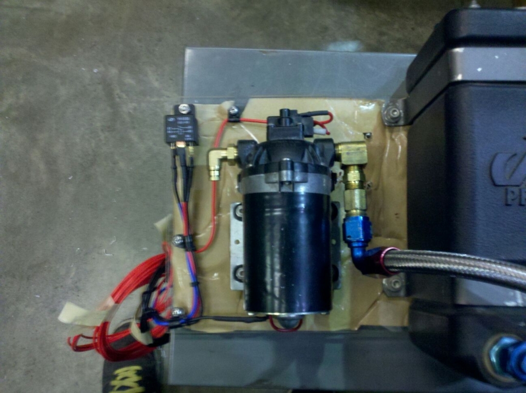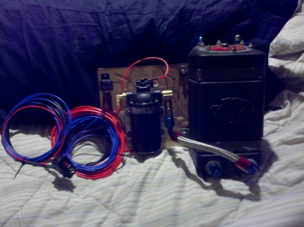 Ok here is another update and I will get some car **** for you as soon as I can. I am waiting on my gaskets to come in so I can remount my turbo with the 1/2" spacer. In the mean time I have been building a methanol injection kit. I got a devils own pump with a 1.25 gallon fuel cell and will be running a hobbs switch. and I am also wiring in a purge switch and two leds one for system hot and one for system spraying. I have the kit almost complete except for the hobbs switch and some line to run from the pump to the engine. Pieced it all together with some freebies from friends for about $125. Should be a solid working kit and I have a few different nozzles to use and can always get more. I have also finished extending my harness and am going to stick it back in the car for a test fit this week and hope that I can get my car mobile at least in the driveway in the next few weeks. I have been working a lot on my daily lately and have not had a ton of time for this car but soon will focus on it again.
