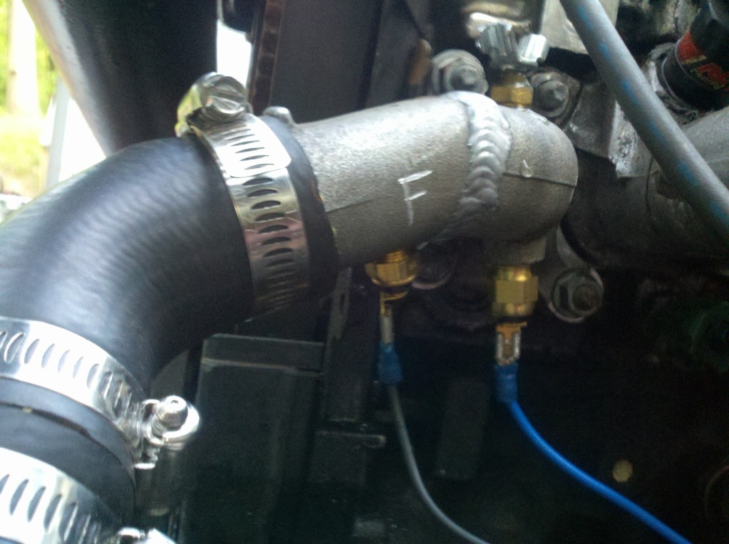Ok so I go all my gauges working and installed, only gauge that does not work is the factory oil pressure gauge and I do not care about that one. I have removed all the extra wiring from the engine bay that I know of and it looks 1000000 times better kinda looks like a real car. I am still need to finish rerouting all the lighting wires in the fenders. I installed the new slim radiator 14" fan it is a close fit but it is in there and I need to test that my fan set up works. I installed a relay with a honda fan switch witch should go to ground at 195 degrees but it was late so I did not start the car. It will be nice if it works and cycles like stock that is the plan at least. I also picked up a stock miata coolant temp gauge and wired it up so I think the stock temp gauge will work as well. You can see in the one pic the two sensors mounted to the bottom of the water neck I used my dremel to mark one "F" for fan switch and one "G" for gauge they look identical so I had to do something. All the fuse box, ecu in mounted and under the carpet just need to mount the FIC. I feel like the car is really starting to come together for real this time so I can only hope it won't be much longer. Still need to mount diffuser, fenders, bumper, headlights, and possibly seats. I also need to really start to think about what I am going to do about a hood. Let me know what you all think sorry for the long story. I will have a couple short vids of the gauges tomorrow.