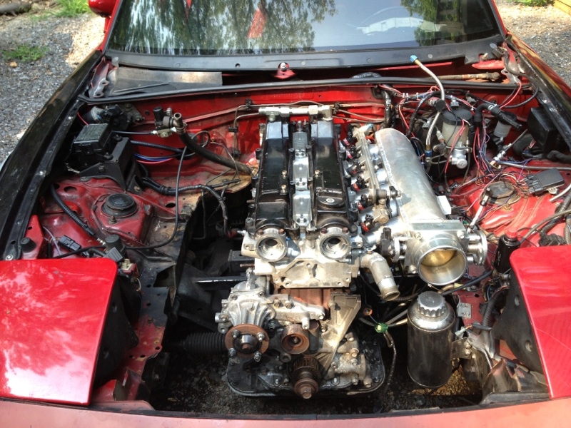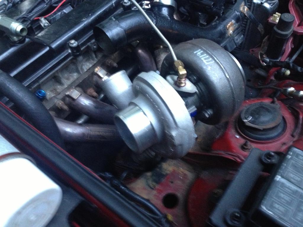 Ok so I spent all day saturday removing my engine and trans cleaning it and installing the oil pump, upper and lower oil pans, and transmission output shaft seal. I am hoping to rid myself of any leaks I am sure some more will come along but for now the engine should be leak free. Sunday I put the engine back together the headstuds are in head it on intake timing belt crank and cam seals. Bassically everything I could think of that may leak I tried to prevent it. I did not finish because I am currently trying to make a nice cover for my distributor and I had to go pick up the bigger exhaust housing for my turbo. I should have all this installed tonight. I am going for a .88ar housing to a 1.22ar housing. The car seemed to be running out of turbine it the top of 3rd last time we tuned it so this should remede the problems. Here are a few pics of the process. I should be taking it for a drive tomorrow!!!!!!!! So glad its back together.