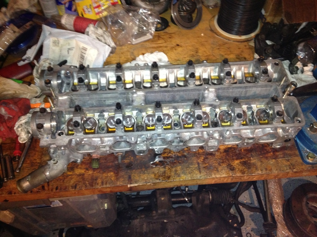 I got the car all torn apart I took the time to pressure wash the head and re lap all the valves and replace all the valve seals. I have the head back together now so as soon as the rest of the parts in I will be putting the engine back together. I am putting in a new oil pump timing belt tensioner spark plugs cam and crank seals everything I think should be replaced since I am in there. Here are a few pics of my head going back together and all cleaned up. I wanted to hot tank it but my friends steam cleaning machine is broken right now so wheel cleaner and a pressure washer is what I got and it worked pretty well.