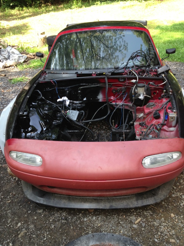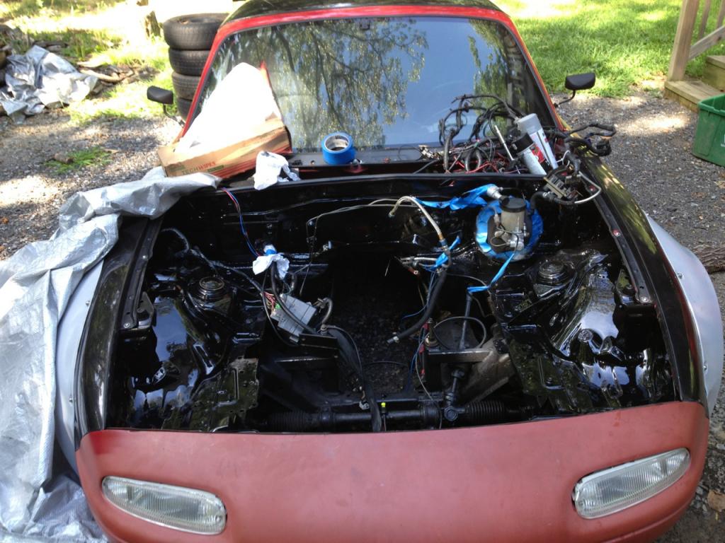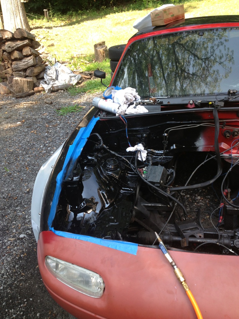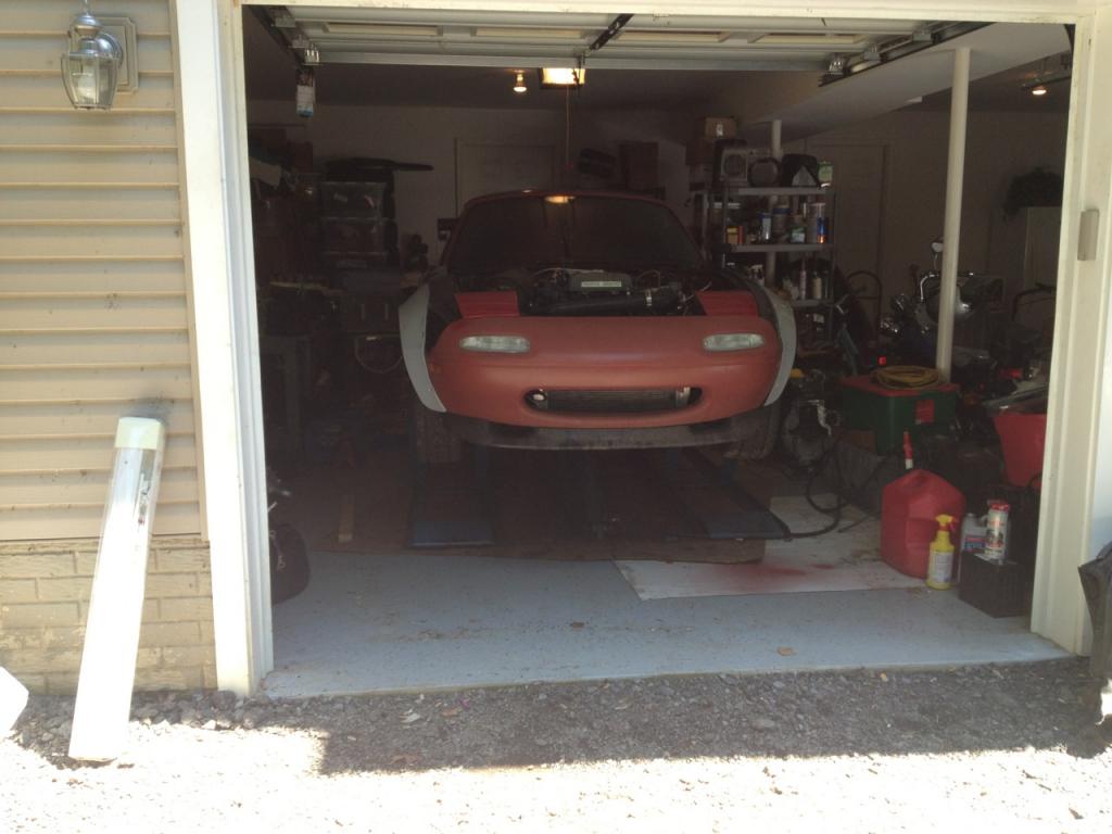 Ok so got the motor out of the car last weekend. I burned a hole in cylinder two. Long story short on that one my distributor was off one tooth and instead of 8 deg base time I had 15 deg and so boom boom. On the other had I have another motor working on getting that ready to install tomorrow. I also took some time even though I did not want to, to paint my bay. I went with gloss black I used enamel paint from tractor supply its about $6 a can and I have used it in the past on other things it holds up well and is hard as a rock. I am glad I did do it now that I see it. One day when I decide to really tuck all the wires I will paint it again and fill all the holes and do all the engine bay welding I can think of probably this winter. Here are a few pics for you guys I hope to have this thing back on the road next week.Also I took some time two weeks ago get get my new toy working best $250 I have ever spent hands down. It a scissor lift goes up 31" and it will go all the way up and the miata still clears the garage door opener.lol