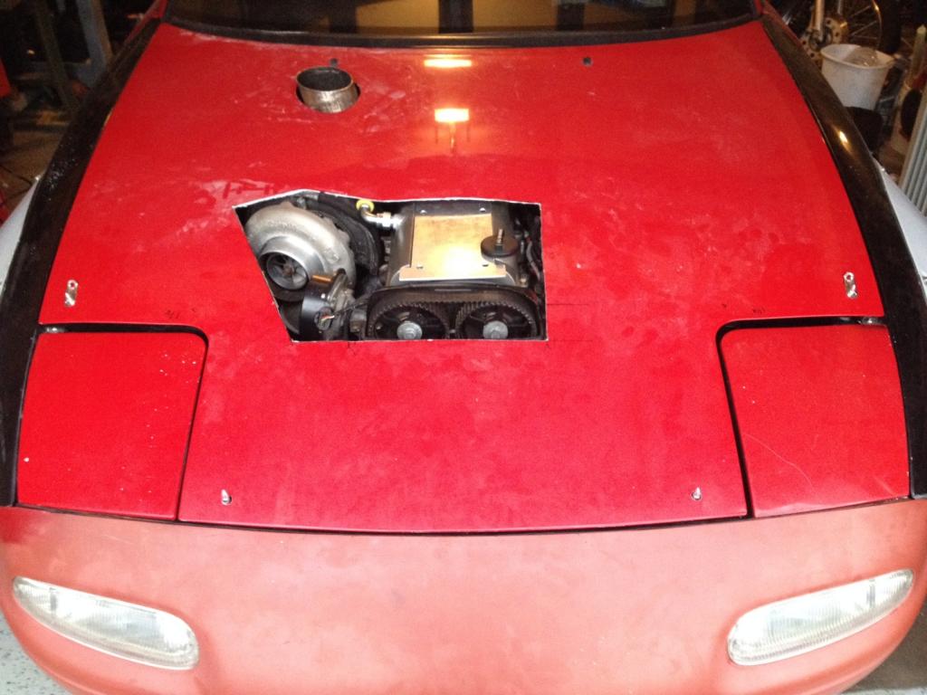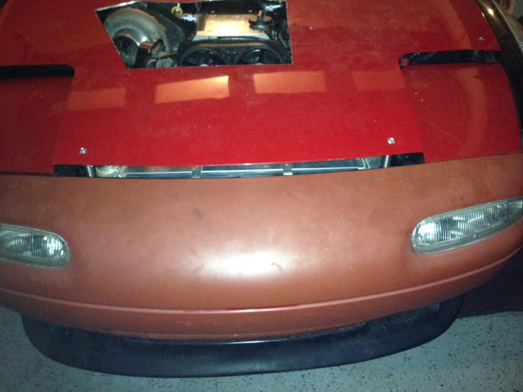 Catch can mounted and lines made. Exhaust is trimmed and sticks up 1/2" evenly around hood cut out. Need to mount boost controller and finish making charge pipe.
