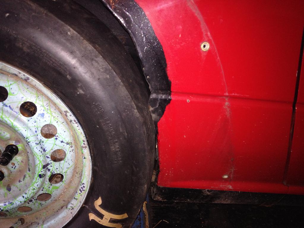 Ok I am back I got some work done this weekend. I finally got my rear diffuser installed after a rear of it sitting in my garage. I GOT THE 26X8.5" tires to fit!!!!!!! Did some more trimming on my fenders and my flares. Fixed most of my camber issues, Started on some body work. I started to repair the drivers side rocker box not done yet but getting there. I still have to install a set of hood pins. Make a support for the front of the rear flares since I trimmed out their support lol. Weld up the rear fenders where I trimmed them and then its off to the shop to finish the intercooler piping. Here are some pics you can see how much of the rear bumper support I trimmed away and you will also notice where once was the rear tow hooks are gone to clear the diffuser.