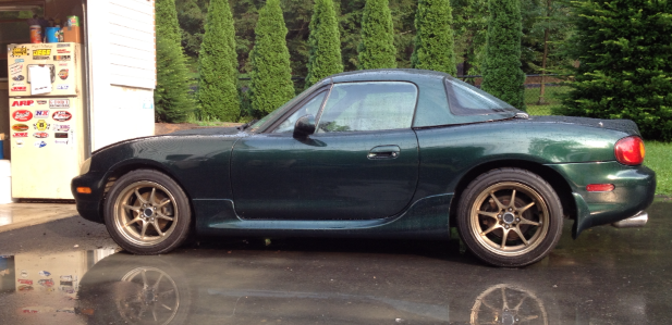 1999 Miata, internally stock 1.8 with 165,000 miles. Modified FM manifold (as seen here https://www.miataturbo.net/diy-turbo...anifold-71282/), with custom built SR20 T25 machined to accept a 60mm wheel (journal bearing 2560) external wastegated setup with Tial MV-S 38mm water cooled wastegate with custom braided line setup. Modified FM downpipe, custom turbine outlet with V band flange connection to FM downpipe. 2 1/2" midpipe with no cat's or resonators. Racing beat dual outlet muffler. Hard dog Xtreme roll bar with hard dog door bars. Rev build MS3 PNP, with Innovate LC-2. Konig 15X8 +25 Flatout's in bronze with yokohama 205/50's. Flyin Miata springs w/ dead coils cut to set proper ride height on Bilstein HD's, FM sway bars.