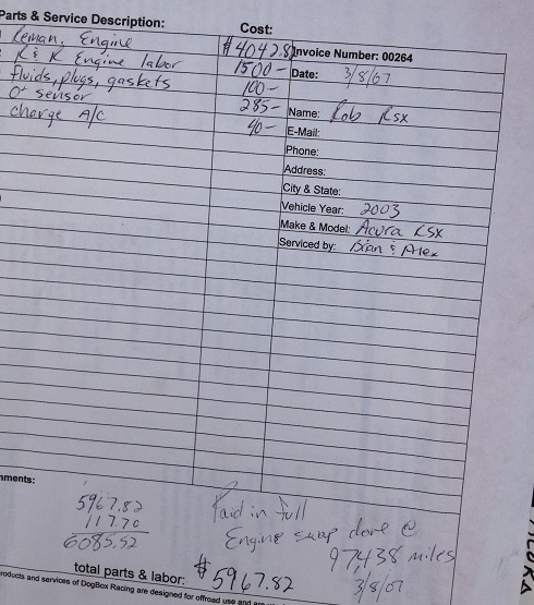 The car runs and drives actually pretty well. The radiator support is jacked, and the hood and passengers fender, but otherwise it's not bad. I'm going to part the whole car, and use the engine/ harness/ ECU for my Kmiata swap. Best part is, it's an 03...which uses a K20A2 engine. However, the guy told me that that's not the original engine...and provided me with this receipt: