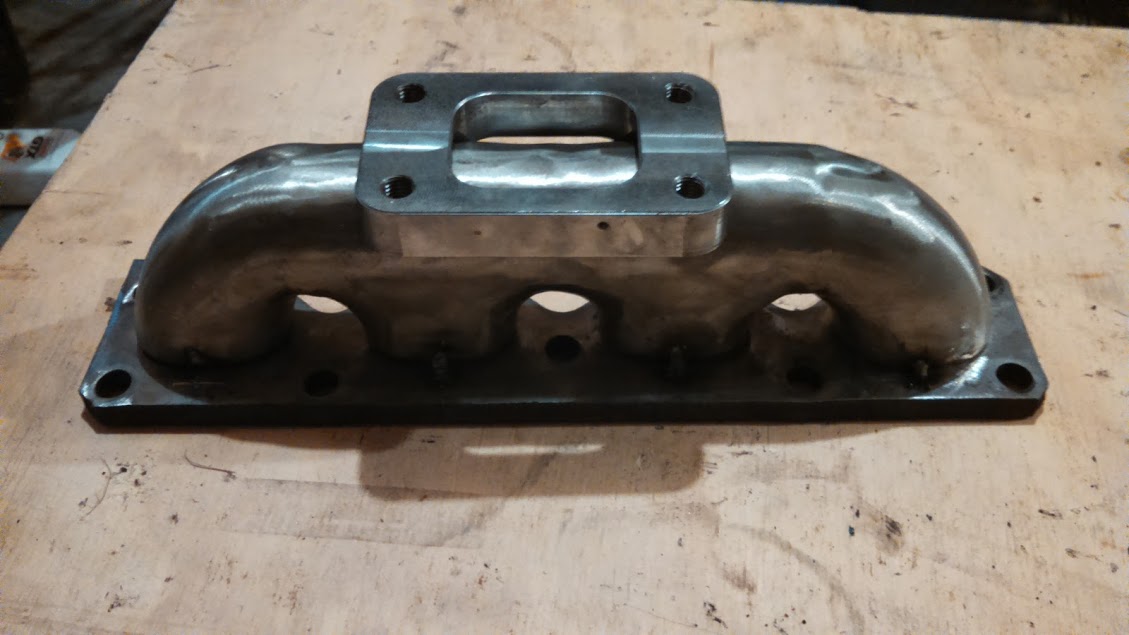 Also, here's DIY manifold V1 (left) and V2 (right). V1 uses 1.5" pipe and the OEM header flange, V2 uses 1.25" pipe and CNC'd flange off Amazon. I'm liking V2 much more, besides the 3D machined flange, the overall height is lower without any trimming of the pipe, making for easier turbo-to-frame rail clearance and the smaller radius T-fittings give better access to the middle flange stud-nut.