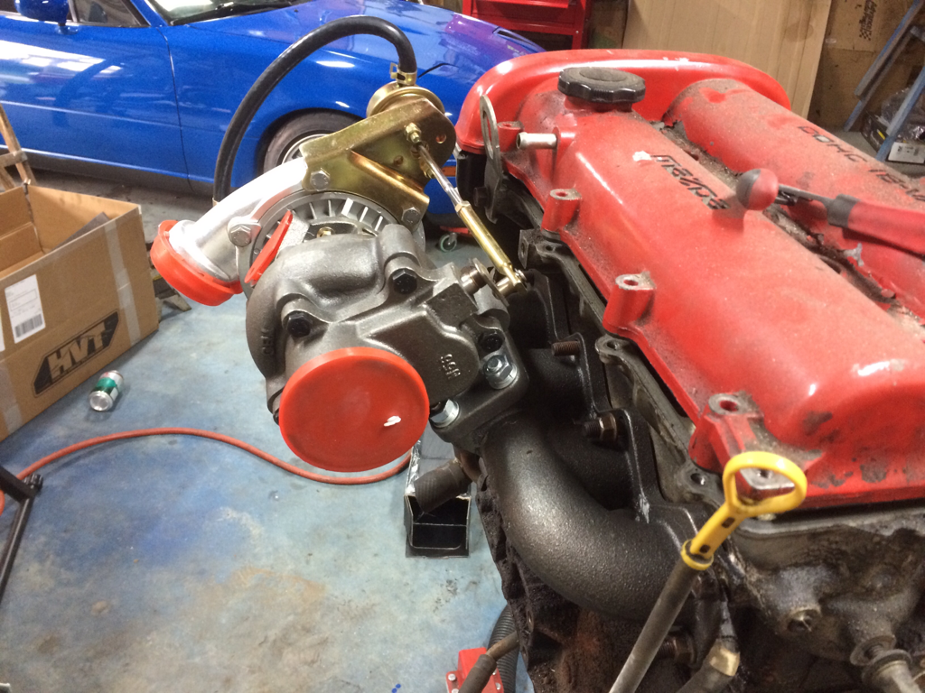 Clocked center housing to point feed/drain vertically, compressor outlet straight down and re-mount WG actuator, which is conveniently easy on this turbo given that there's six different positions you can mount it on the compressor housing.