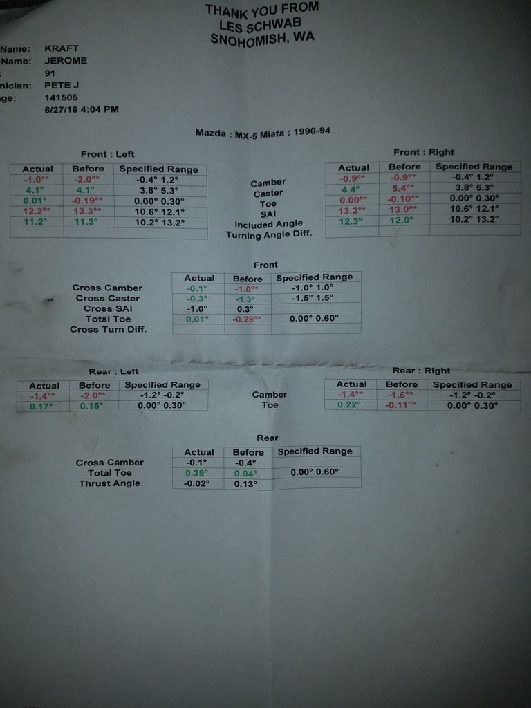 Got an alignment today, but didn't hit the numbers I was hoping for. I was aiming for a super miata dual duty with auto x rear toe, but I came up short ~1° of neg camber up front. My pax front is wonky, and the camber is the limiting factor. Here are the numbers I hit: