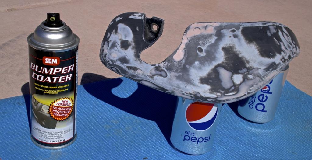 After I cut it I had to find some way to pull the flap up to the body otherwise there would be a 1/2" gap between the top of the curve and the bumper. So I took a heat gun to it and slowly applied heat until it was pliable enough to bend into place, and hold it in place till it cooled enough to retain its shape. Then, I put a few skims of bondo on some of the deeper scratches, sanded out the smaller bumps, and painted it with this awesome awesome rubber bumper paint. Much more durable than just paint, it is very flexible so it won't chip, AND best of all, no plastic adhesion promoter needed.