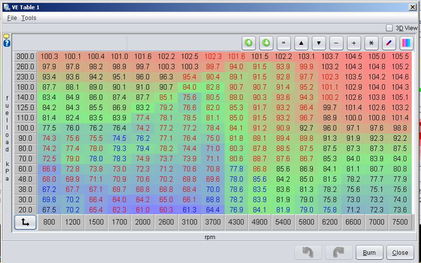 Was taking a look at my VE table just barely and several of the cells in that RPM/KPA range are showing 120+. I adjusted them back to what they were before so we'll see after I fix the coolant hose.