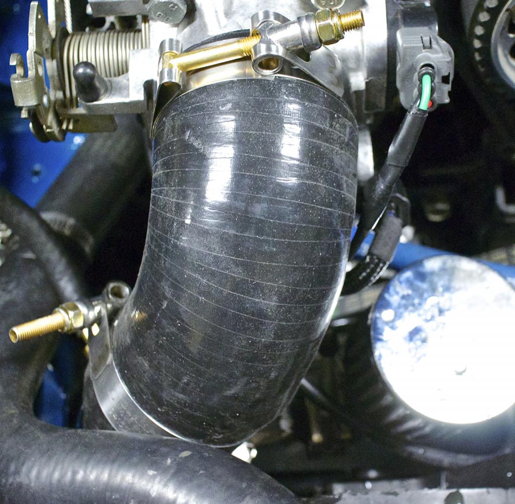 New 90º throttle body elbow. The flyin' miata piece was too thick and wouldn't allow the clamps to properly seal it against the pipe. Tested it by burning some paper and saw it suck the smoke in under load. New one was perfect after trimming an inch off of it.