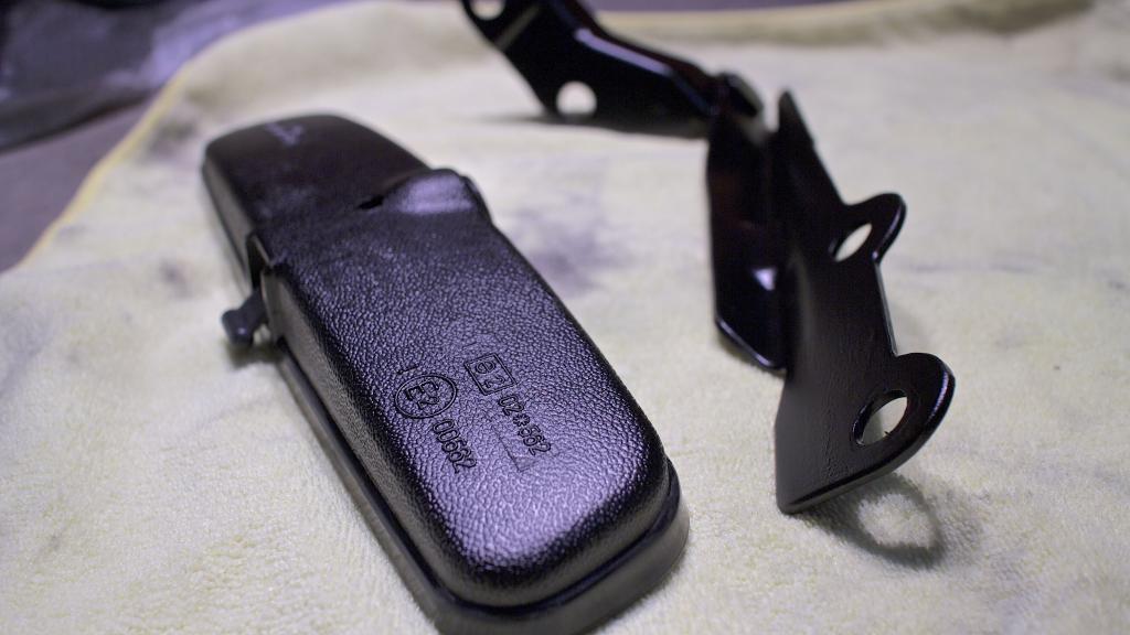 Playing around with interior & upholstery trim paint. It matches black abs plastic and satin black trim pieces perfectly. Painted the rearview mirror and the hood latches since both were pretty faded/chipped even after applying some Adams Super VRT to it. Stripped the hood latches, and lightly sanded the rear view mirror with a grey scuff pad. 2 layers of light etching primer and 4 layers of interior paint.