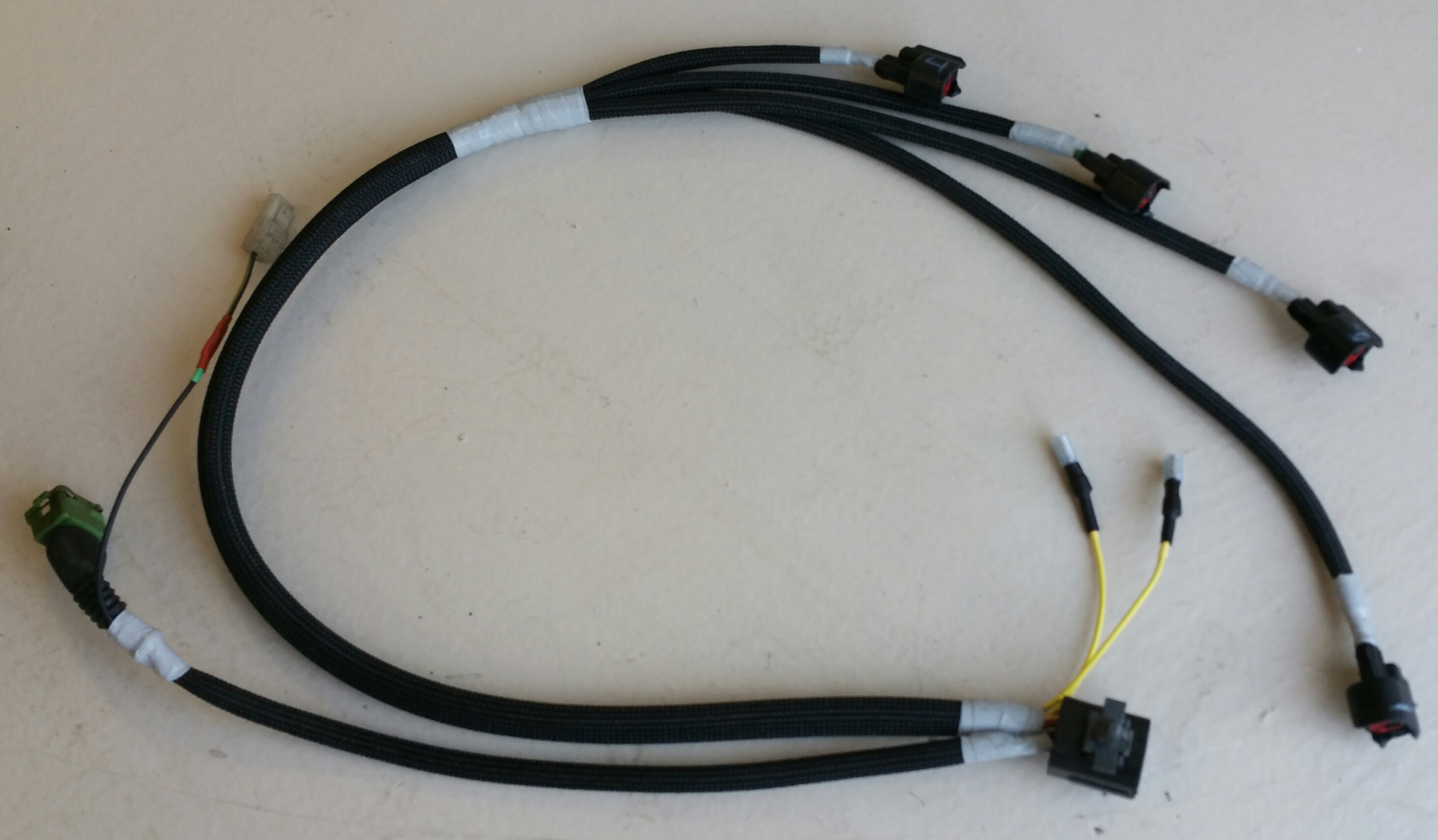 Finished up my injector harness. Took the pins out so I could slide on the high heat wrap(it isn't split) over the wires and used the ultra sticky grey tape to seal it all up. I'm pretty proud of this one, looks great!