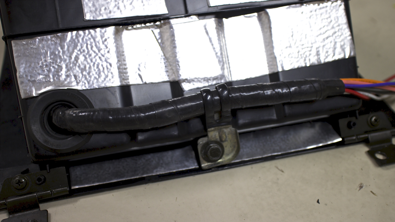 Then I used my 1/2" hole saw bit at the bottom of the glove box and put a rubber grommet on it to protect the wires from any sharp edges. The glove box has an unused screw mounting point in the middle and I used a random bracket to keep it from moving about and potentially disconnecting while driving hard. AEM uses 16g wiring and there is roughly 14 wires coming out of the controller. That is a lot of weight!