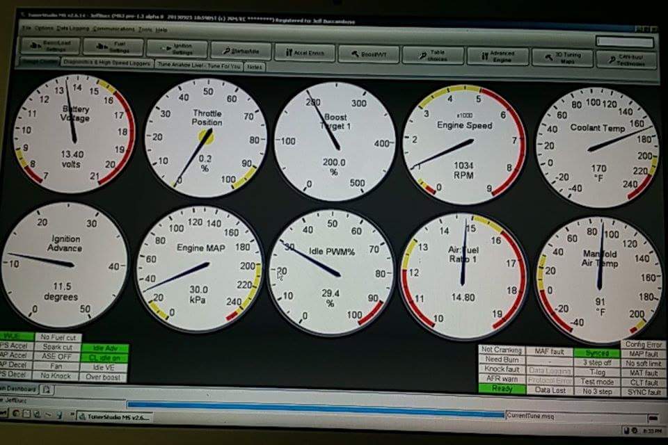 My idle parameters are all sorts of fucky. No idle recovery after throttle input, but I was able to get it good enough to take it down the highway to see if any problems cropped up. Gotta love that TSE radiator. 110º and with no radiator cowling or bottom tray on it held 206º even sitting at a stop light, god bless yah Andrew!