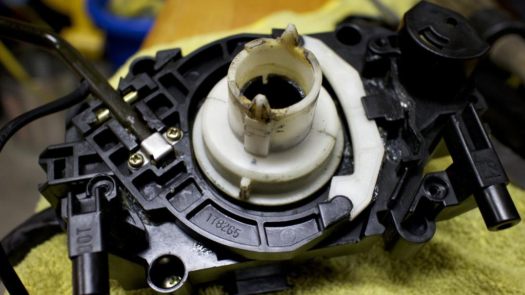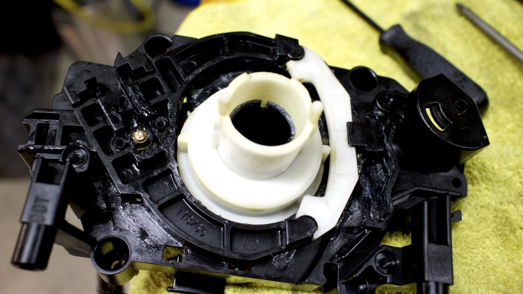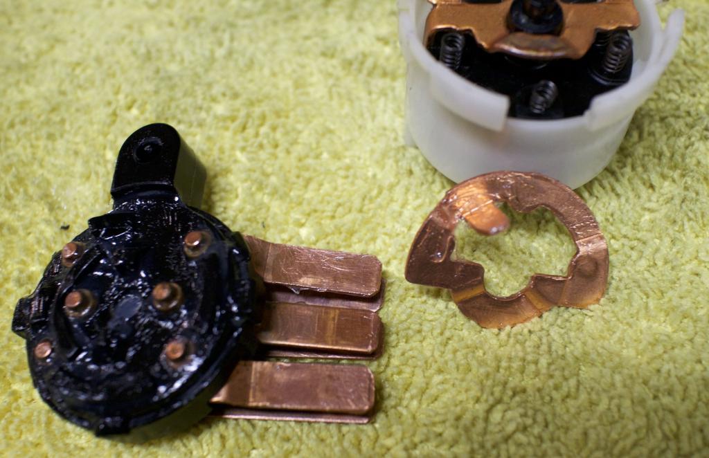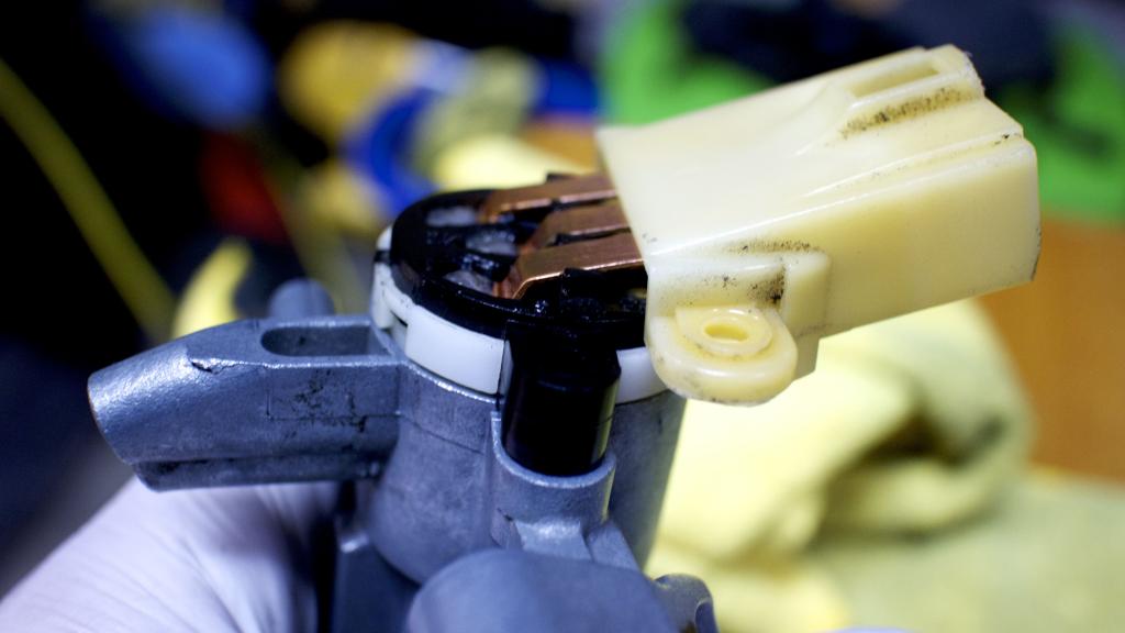 Regreased ignition switch. See the brass 1/2 circle not in? Take note of the tab, that one goes on top of the other.